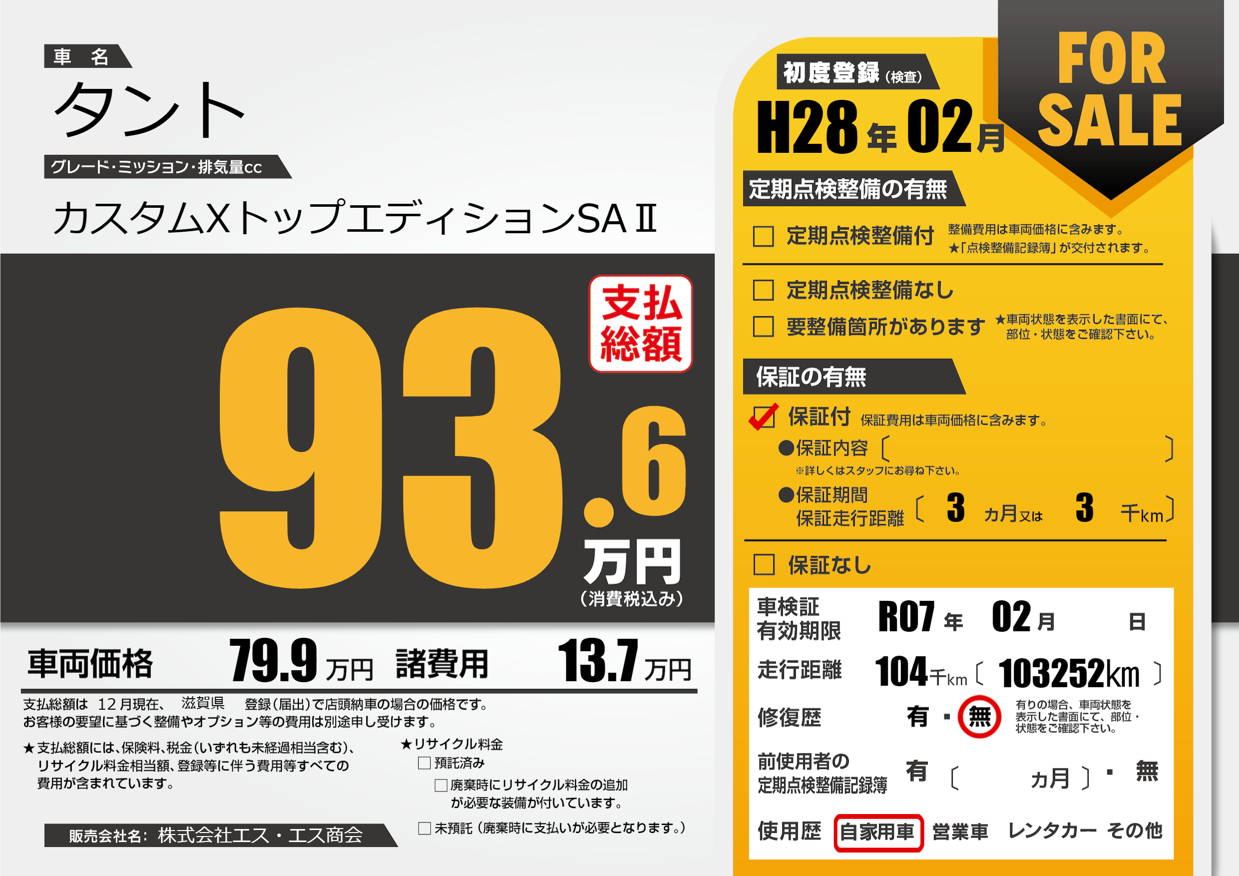 | 走行キロ | 10.4万km | 初年度登録 | H28年02月 |
