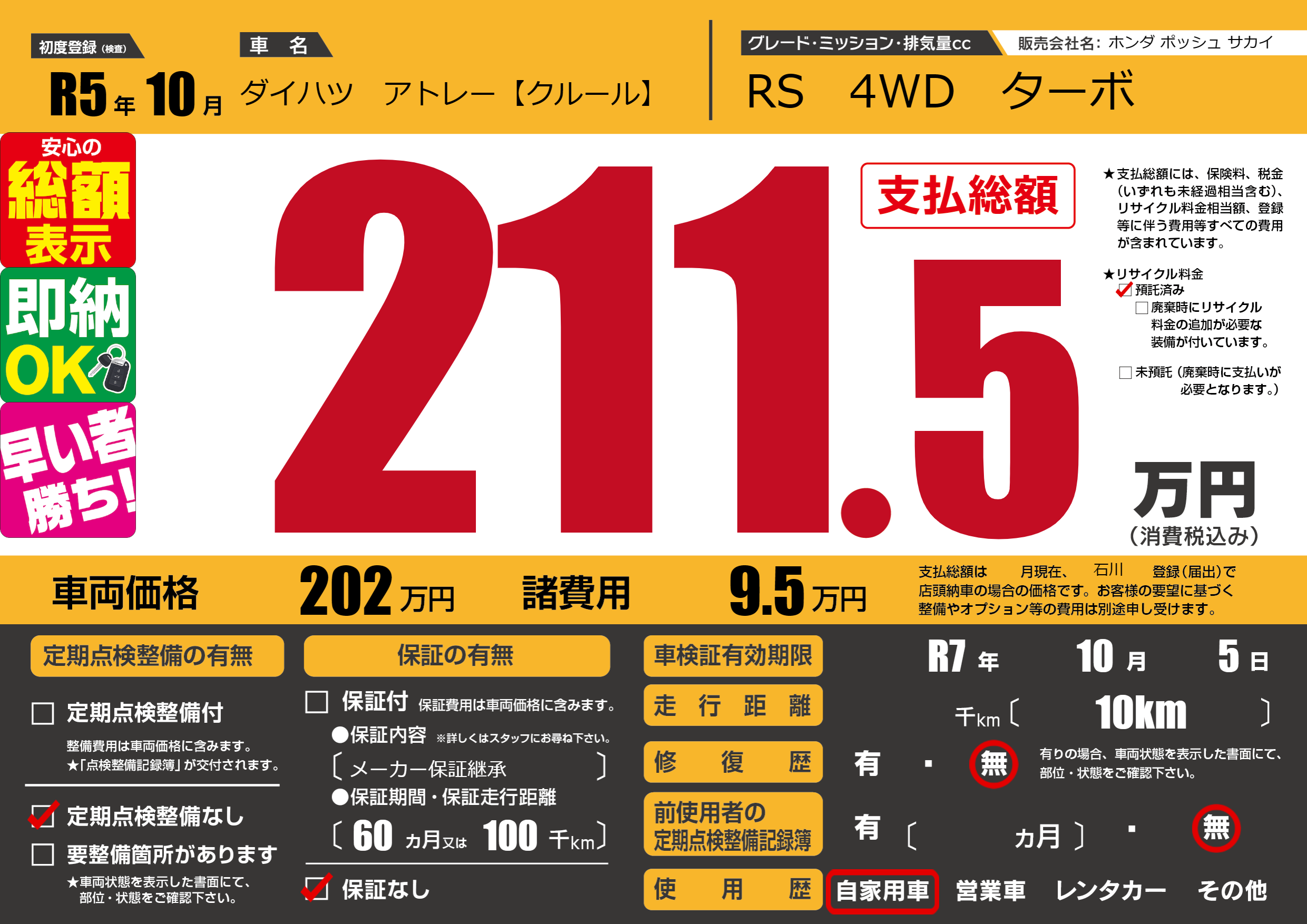 | 走行キロ | - | 初年度登録 | R5年10月 |