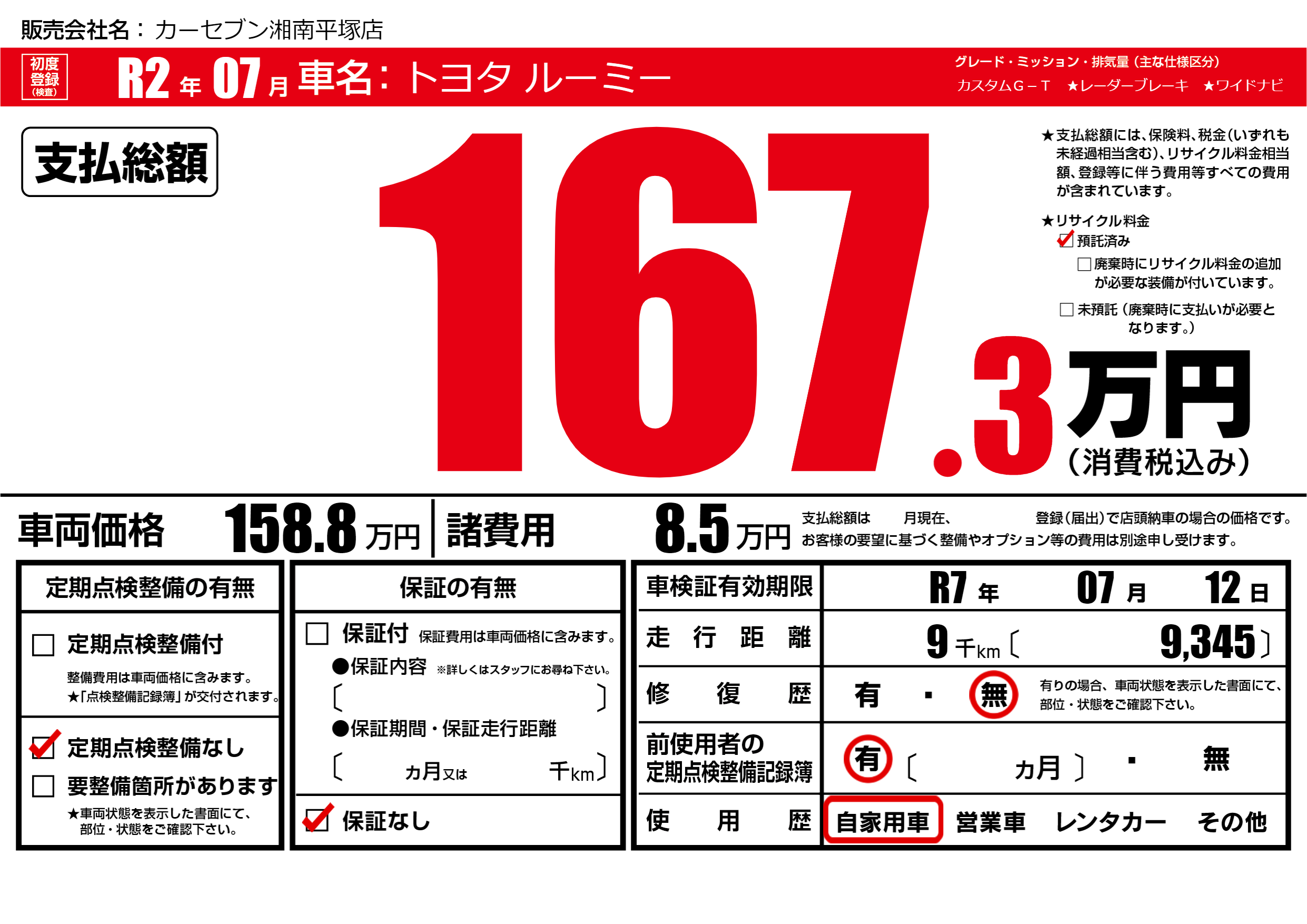| 車名 | トヨタ ルーミー | グレード ミッション 排気量 |
