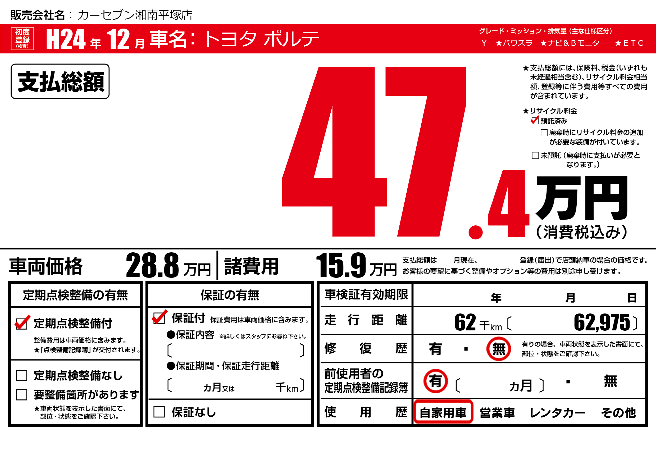 | 車名 | トヨタ ポルテ | グレード ミッション 排気量 |