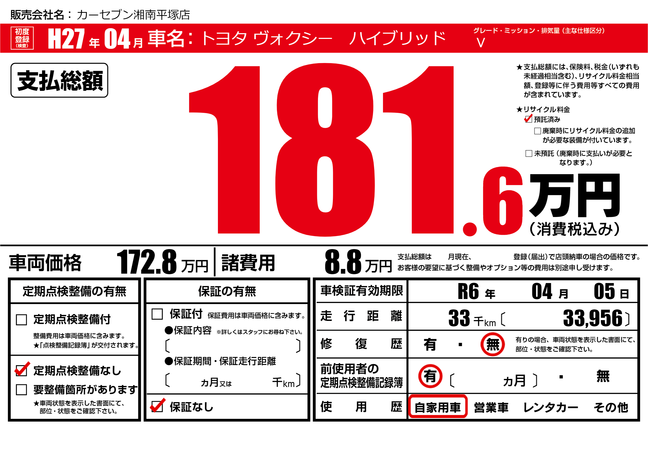 | 車名 | トヨタ ヴォクシー ハイブリッド | グレード ミッション 排気量 |