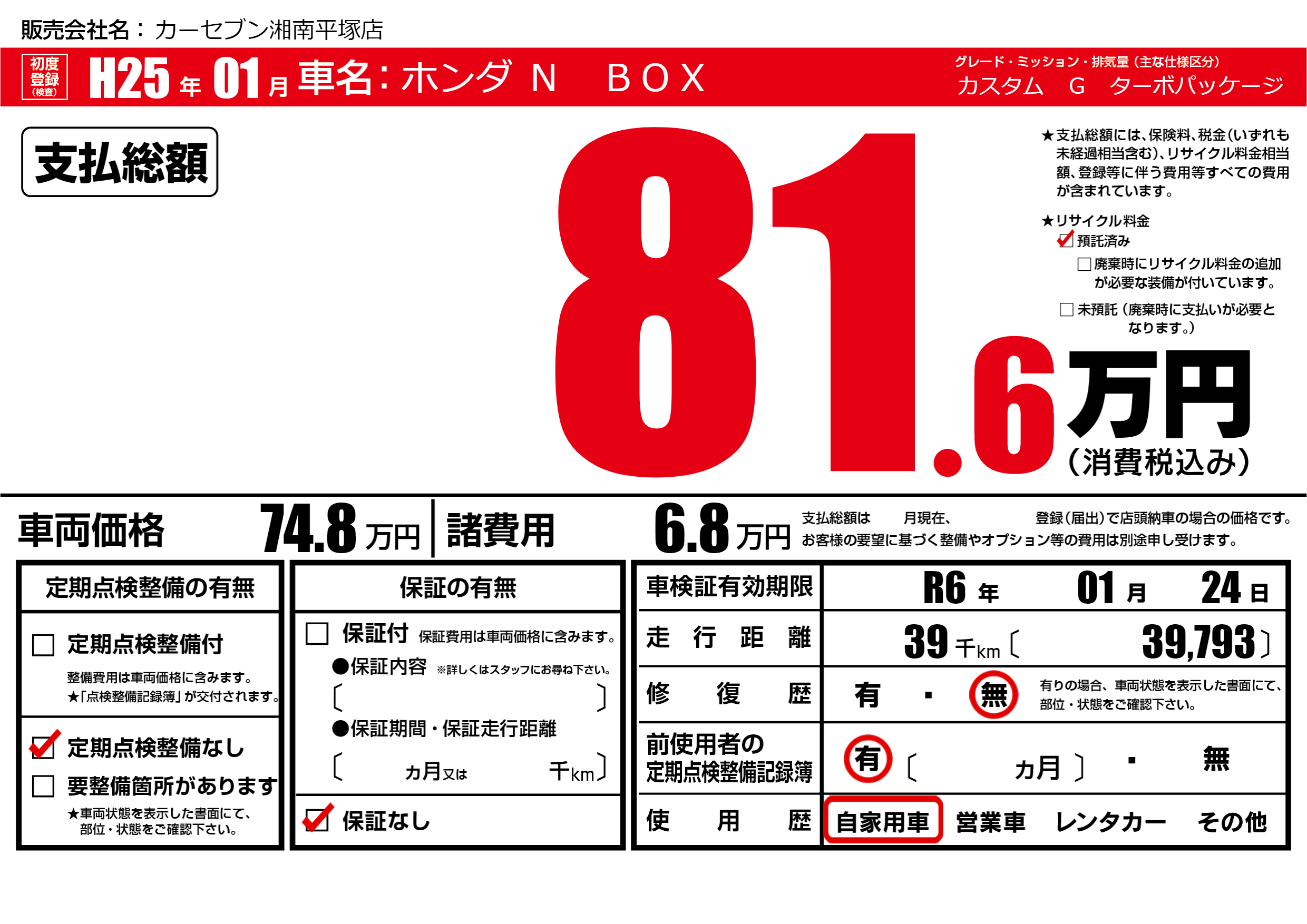 | 走行キロ | 3.9万km | 初年度登録 | H25年01月 |