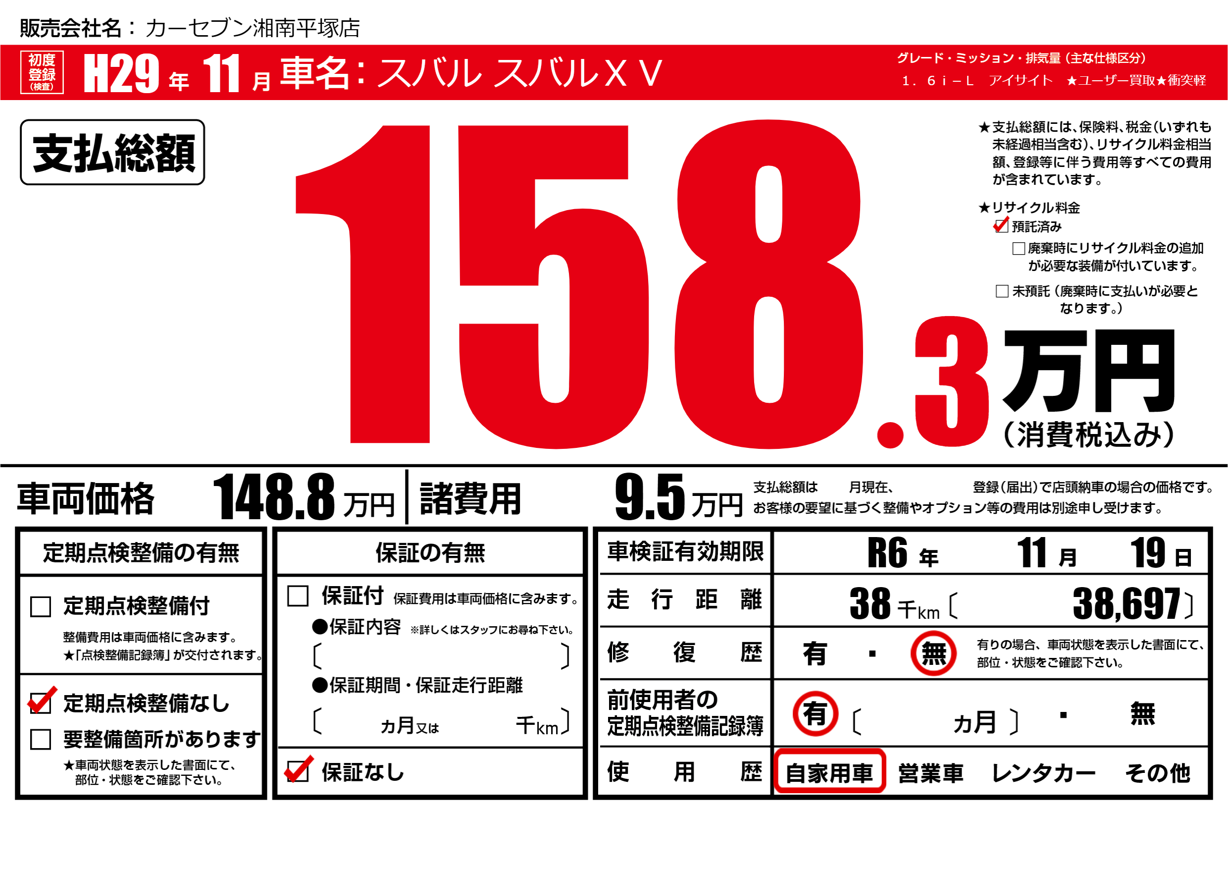 | 走行キロ | 3.8万km | 初年度登録 | H29年11月 |