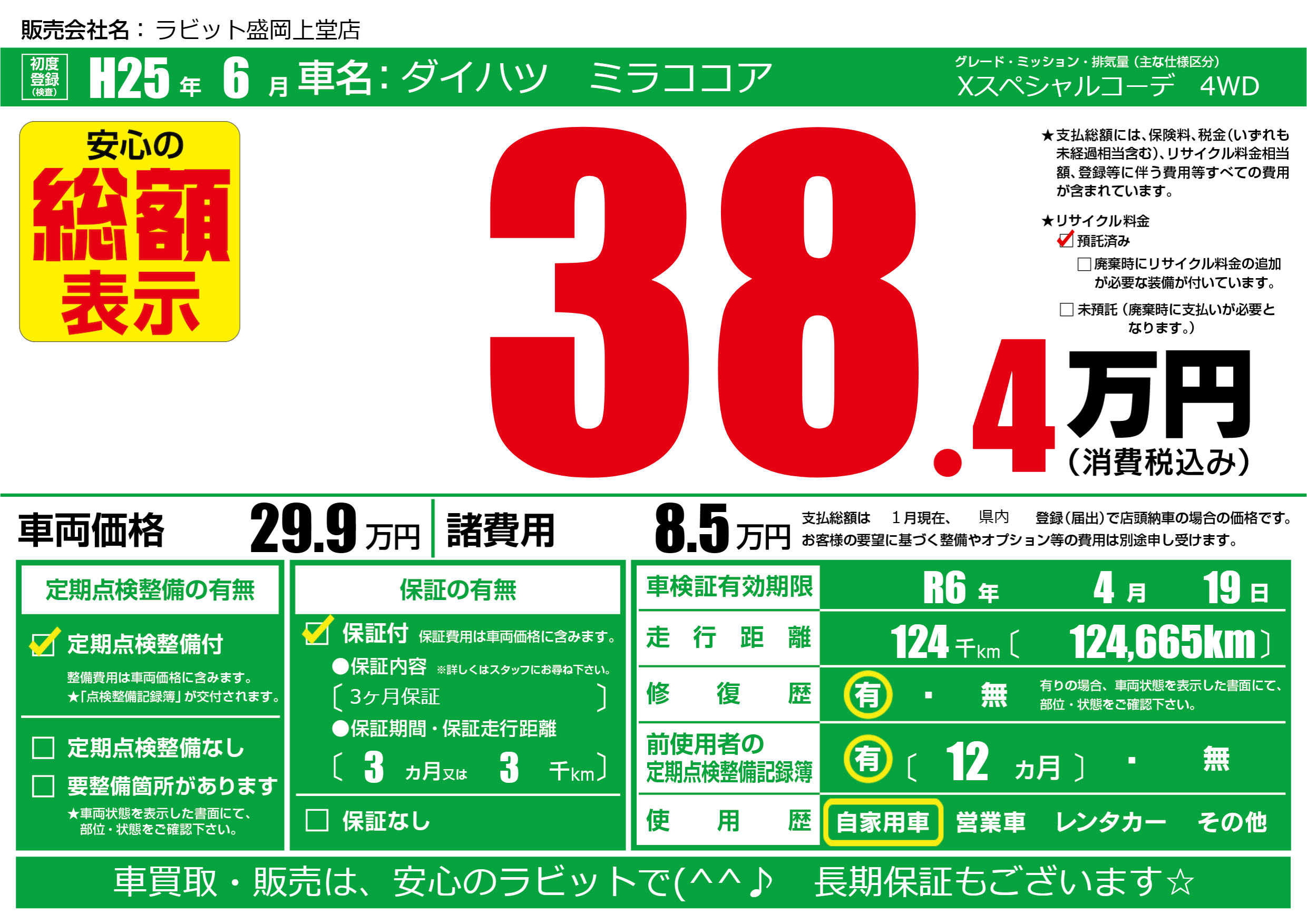 | 走行キロ | 12.4万km | 初年度登録 | H25年6月 |
