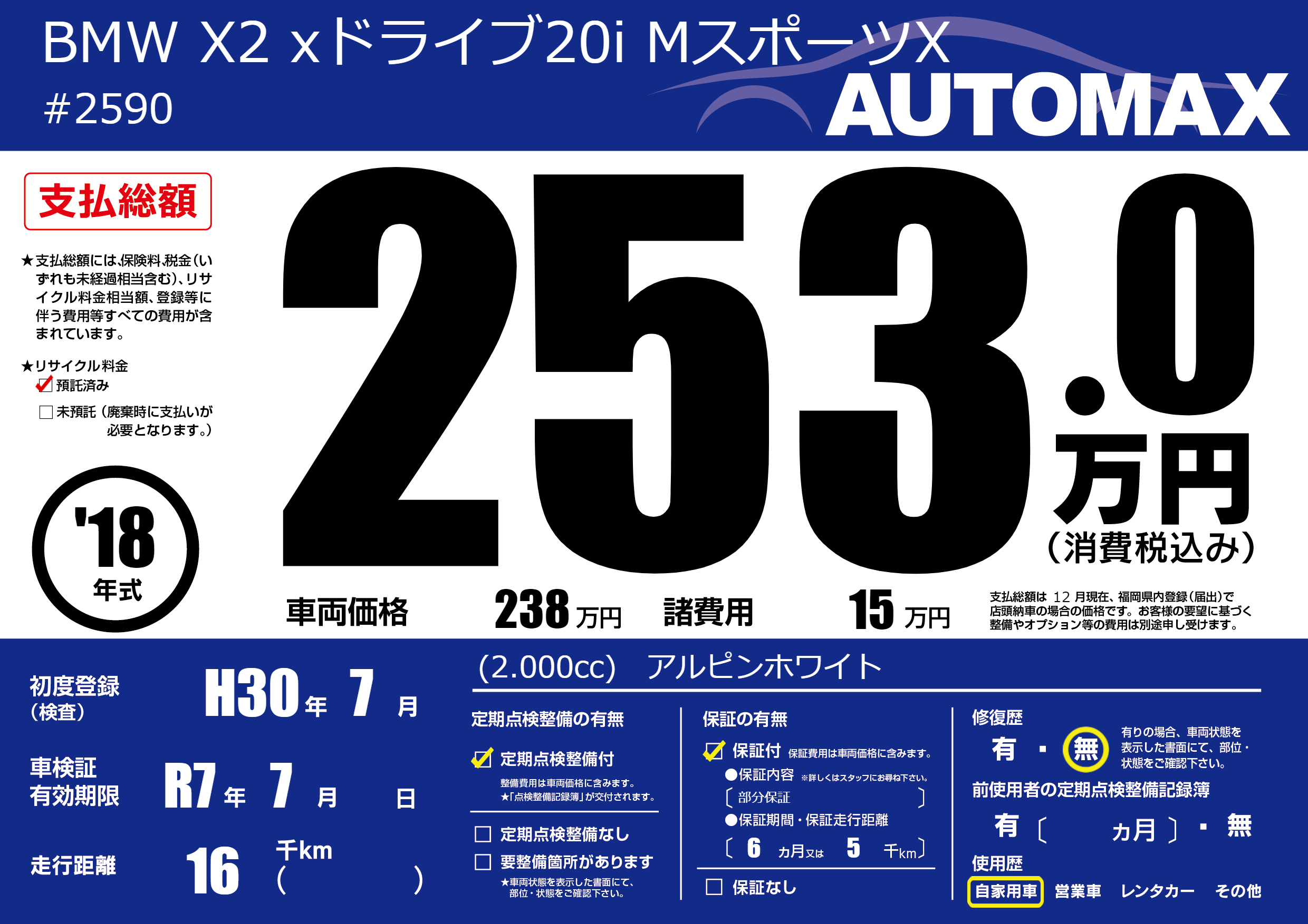 | 車名 | BMW X2 xドライブ20i MスポーツX | グレード ミッション 排気量 |