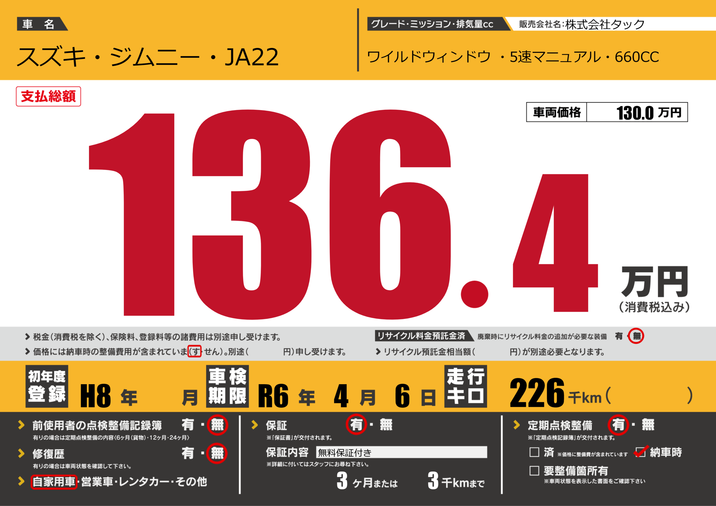 あり | 車検制限 | R6年4月6月 |