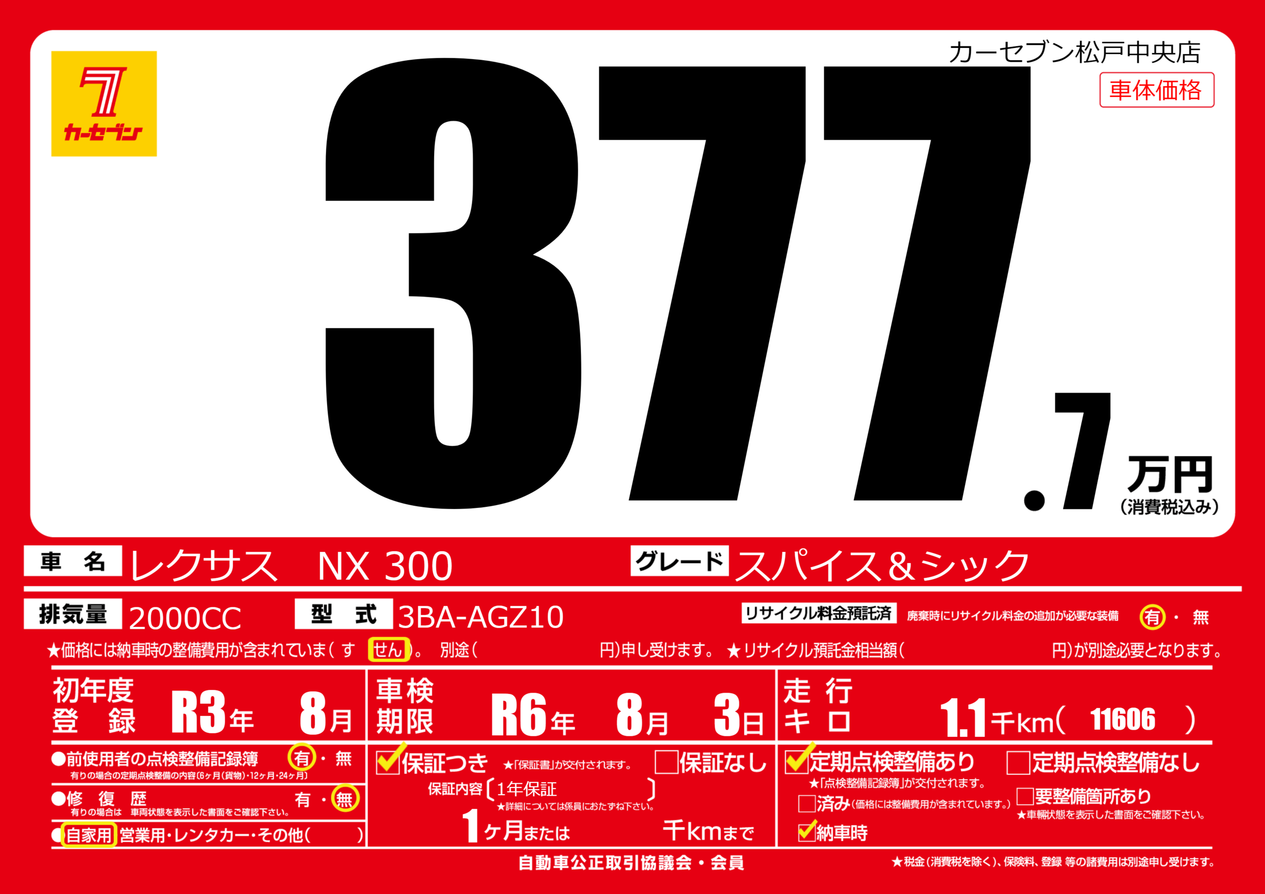 | 車名 | レクサス NX 300 | グレード ミッション 排気量 |