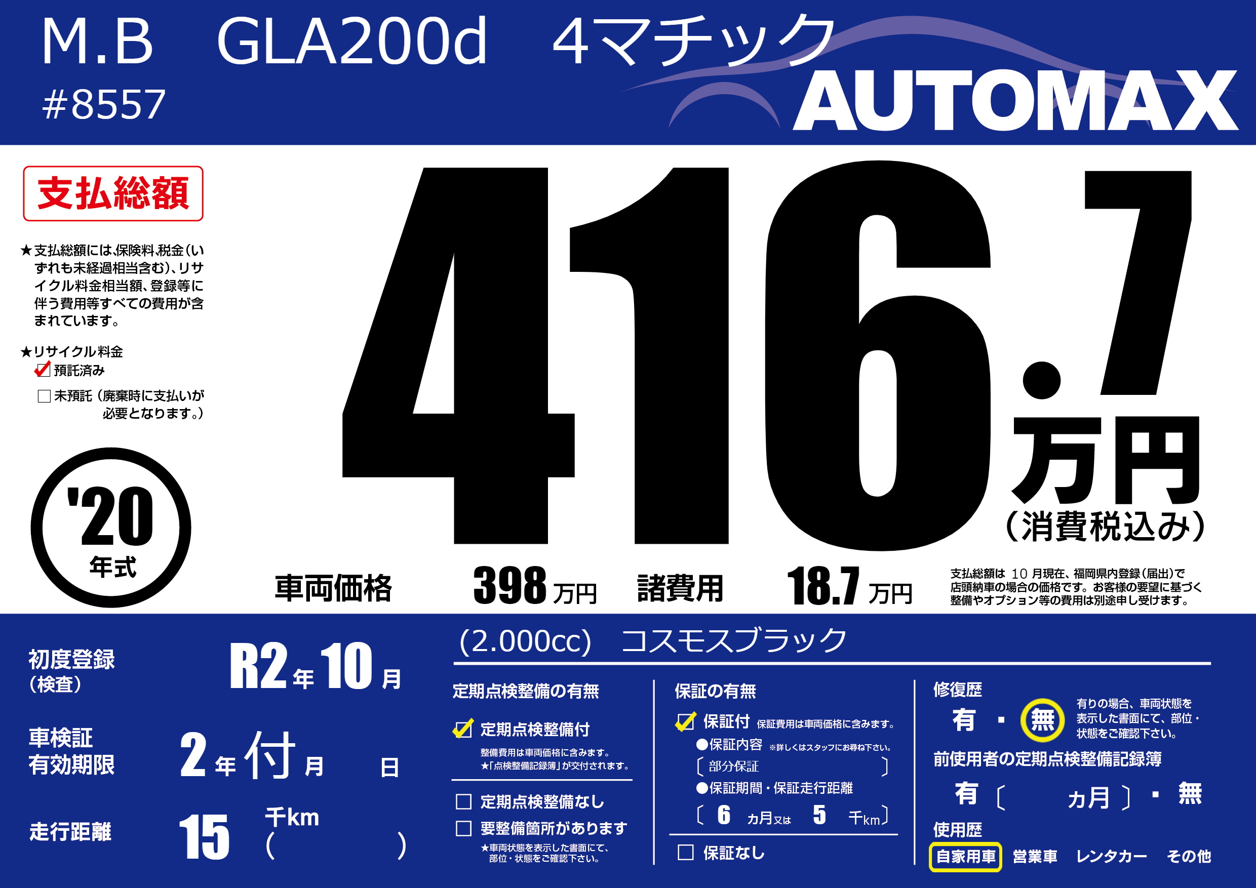 | 車名 | M.B GLA200d 4マチック | グレード ミッション 排気量 |
