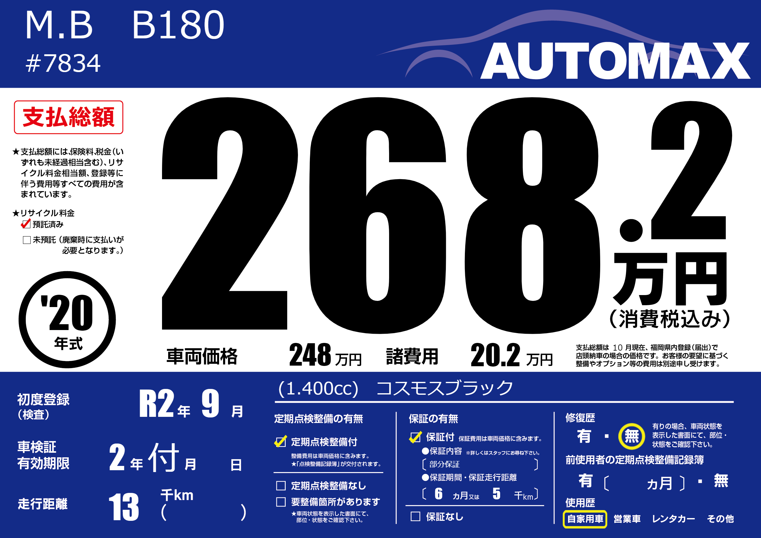 | 車名 | M.B B180 | グレード ミッション 排気量 |