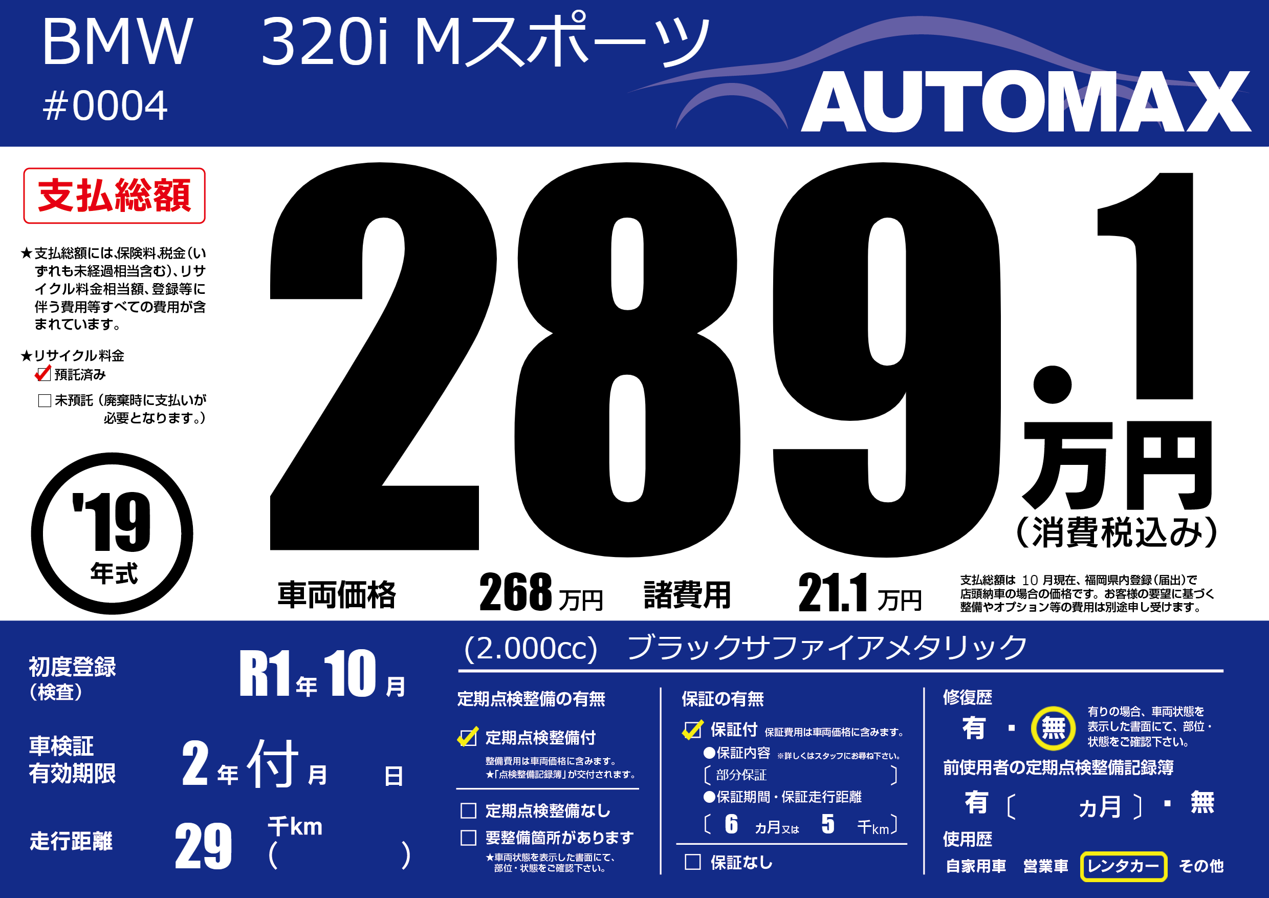 | 車名 | BMW 320i Mスポーツ | グレード ミッション 排気量 |