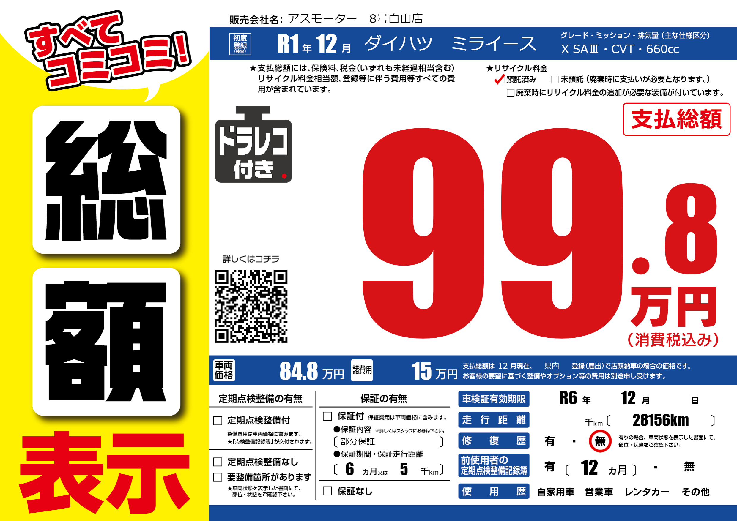 | 車名 | ダイハツ ミライース | グレード ミッション 排気量 |