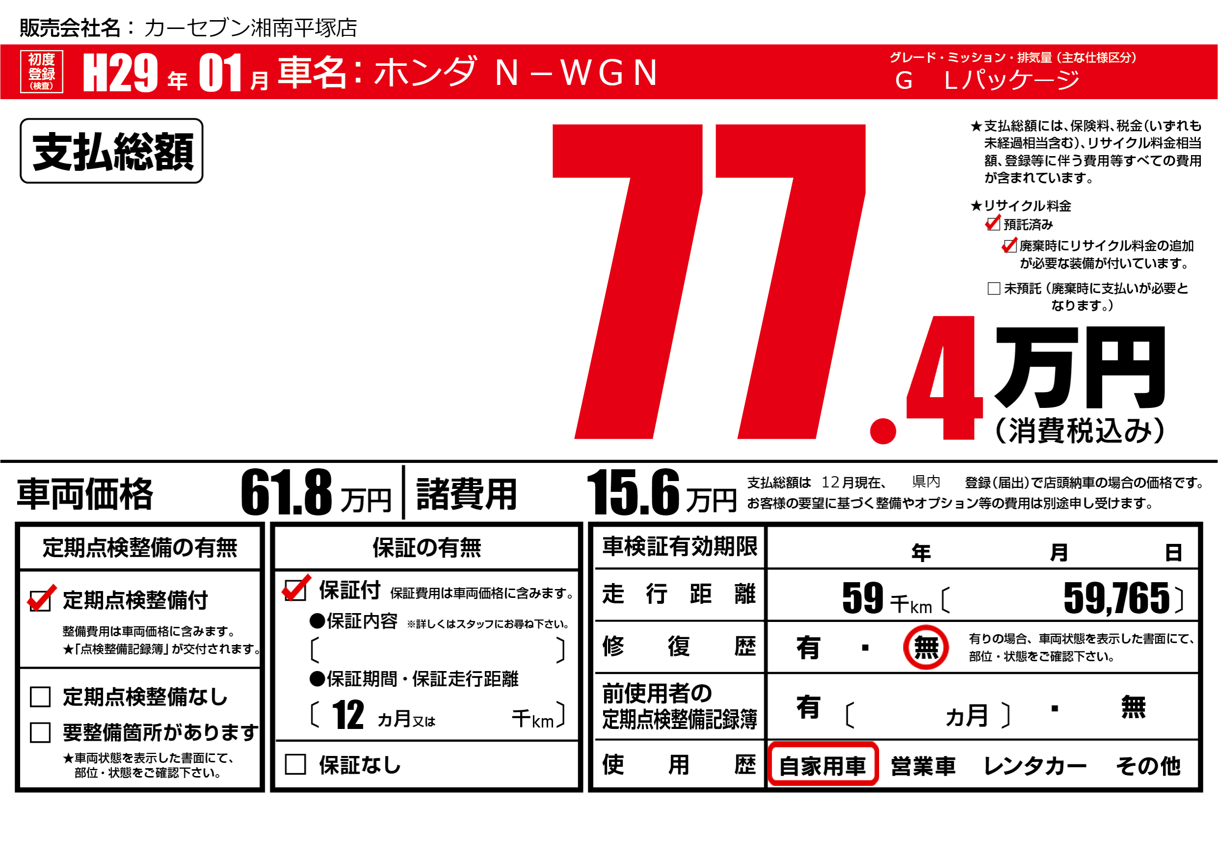 | 車名 | ホンダ N-WGN | グレード ミッション 排気量 |