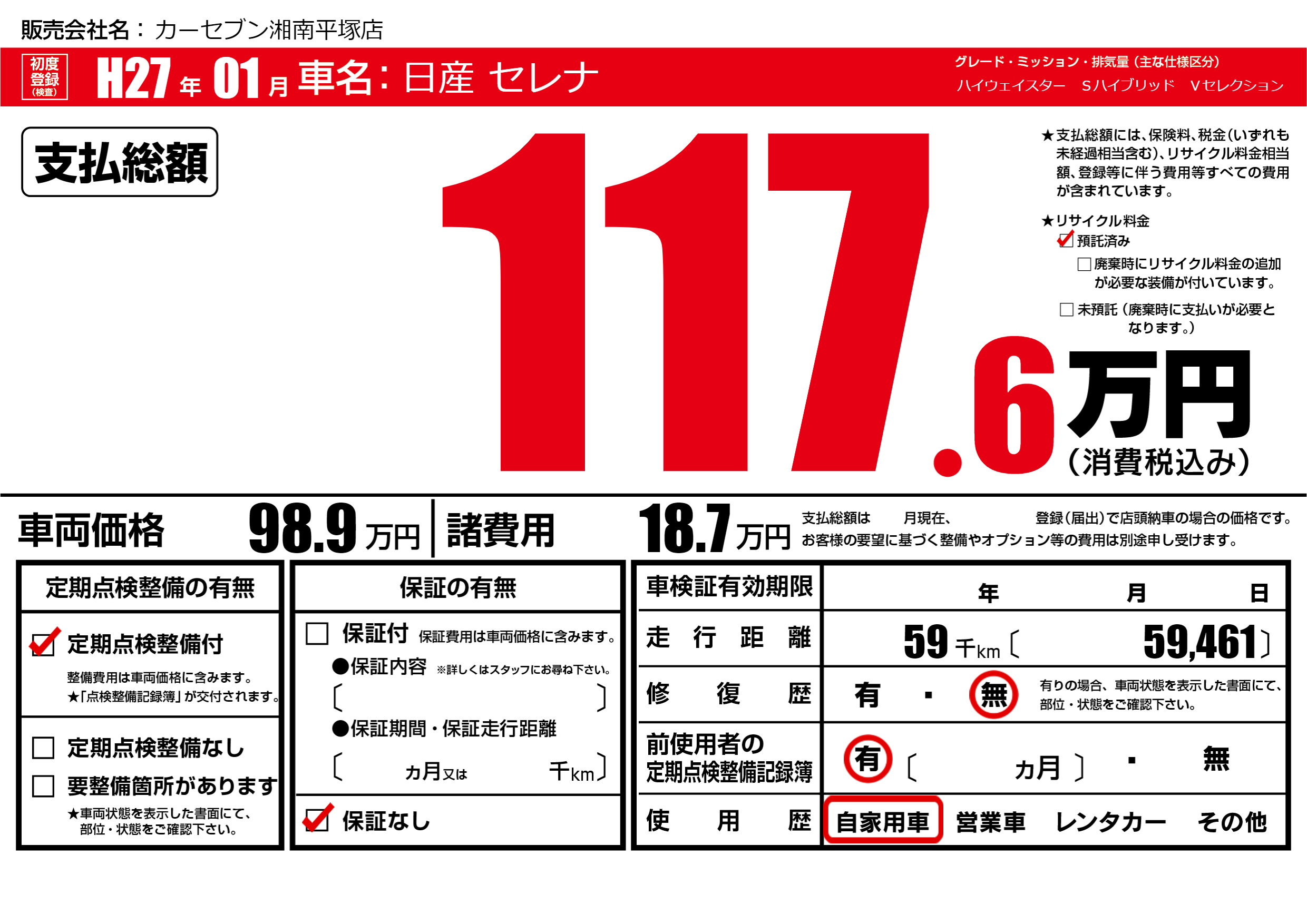 | 車名 | 日産 セレナ | グレード ミッション 排気量 |