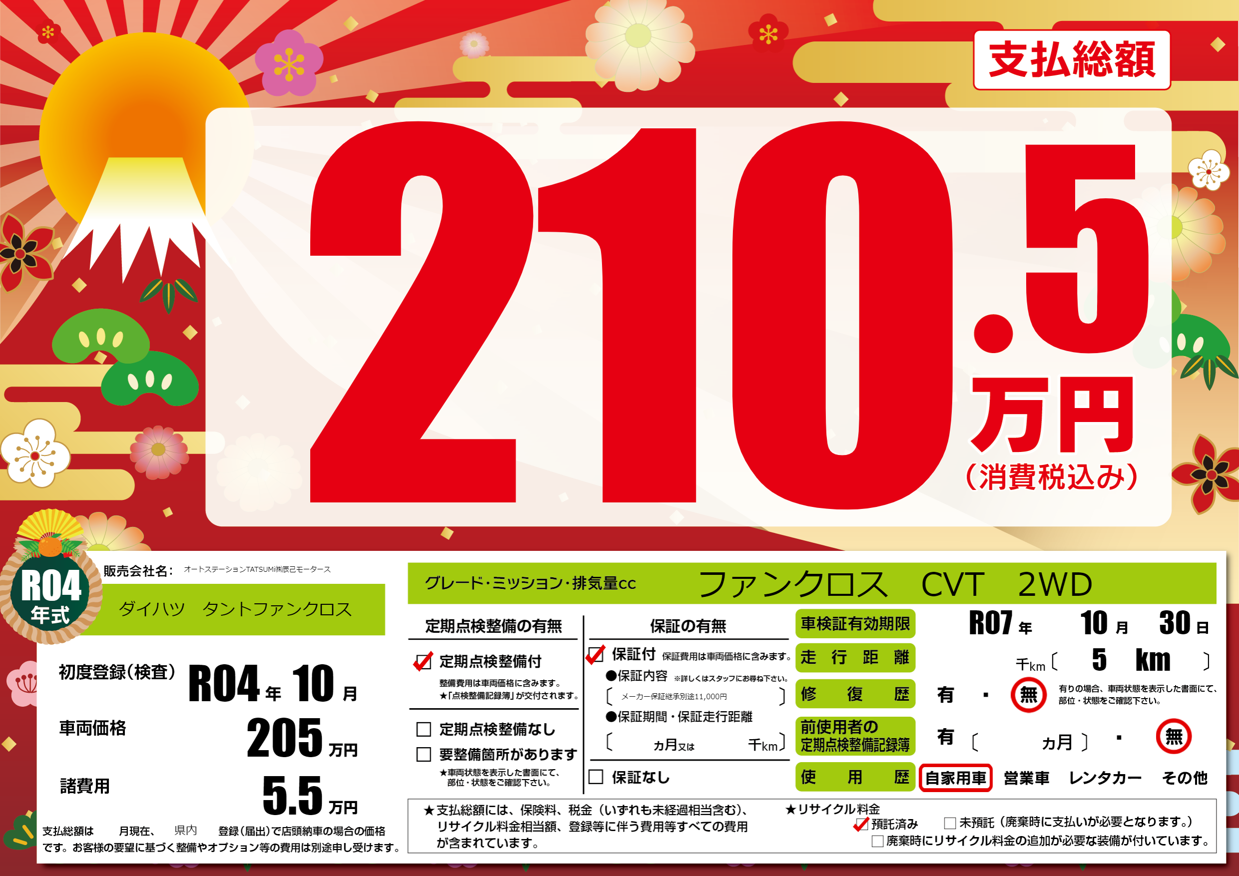 | 車名 | ダイハツ タントファンクロス | グレード ミッション 排気量 |