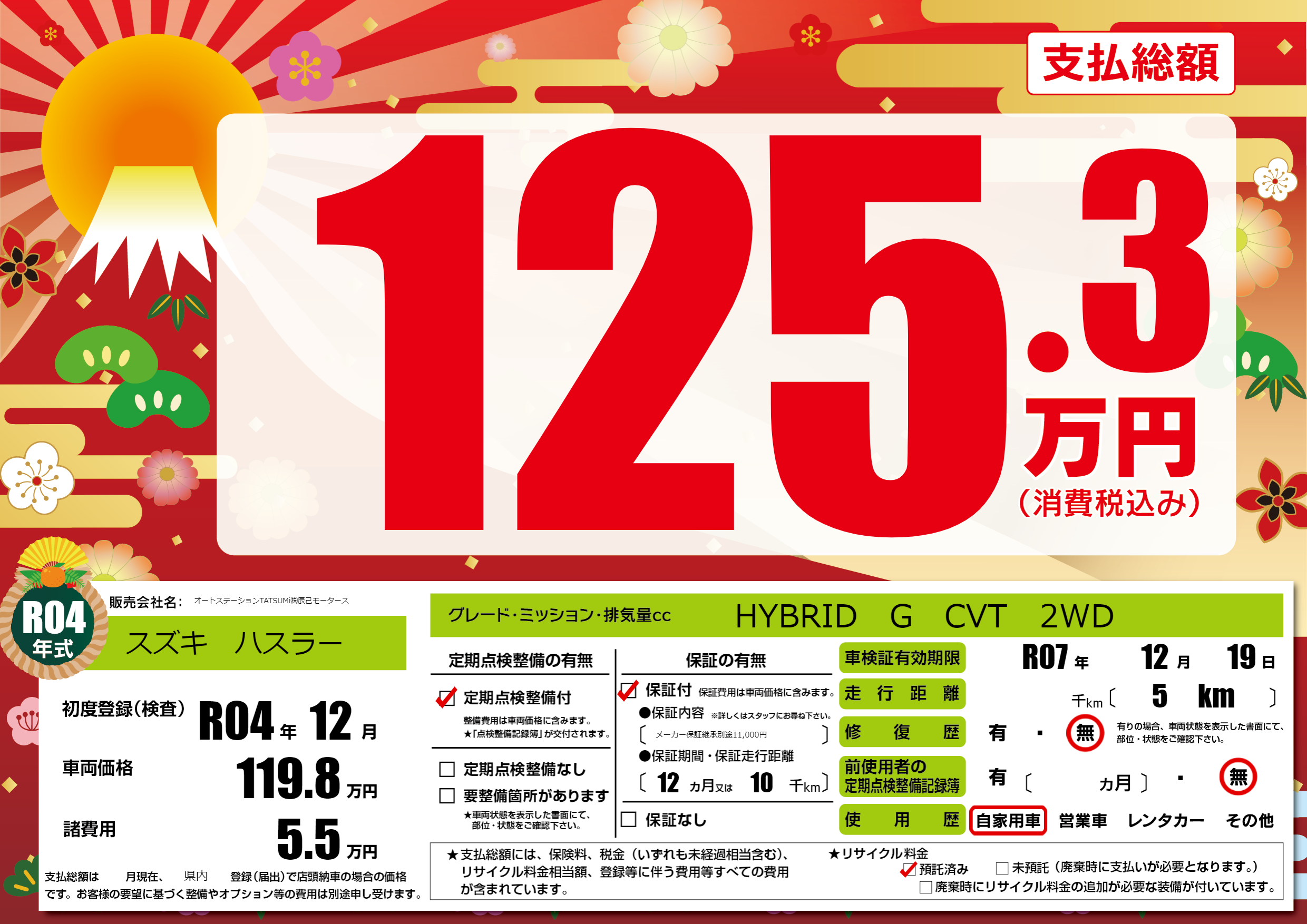 | 車名 | スズキ ハスラー | グレード ミッション 排気量 |