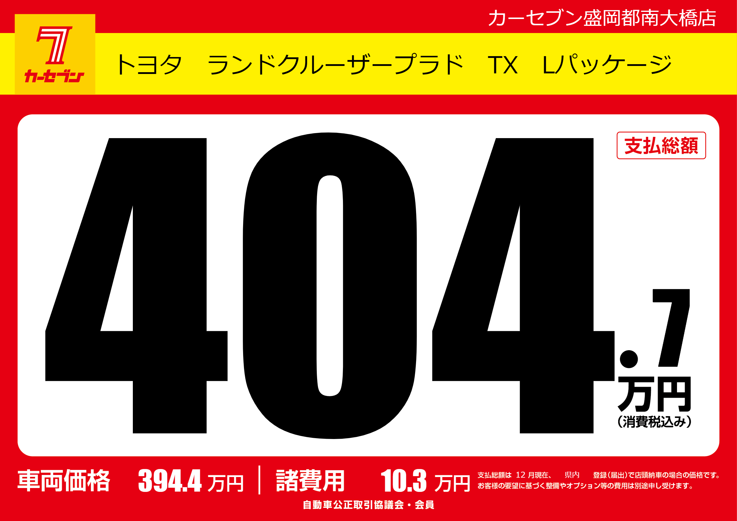 | 車名 | トヨタ ランドクルーザープラド TX Lパッケージ | グレード ミッション 排気量 |