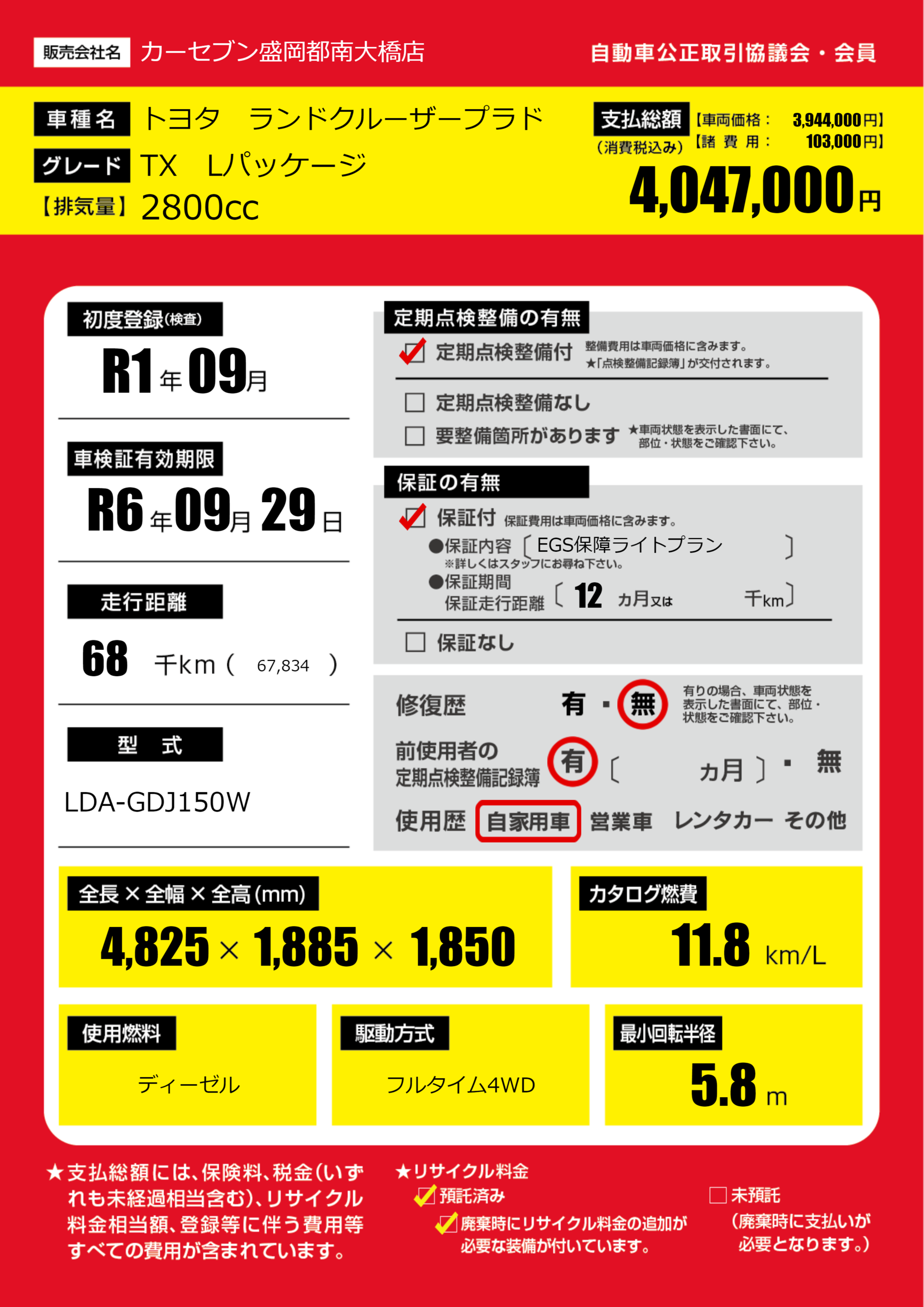 | 車名 | トヨタ ランドクルーザープラド | グレード ミッション 排気量 |
