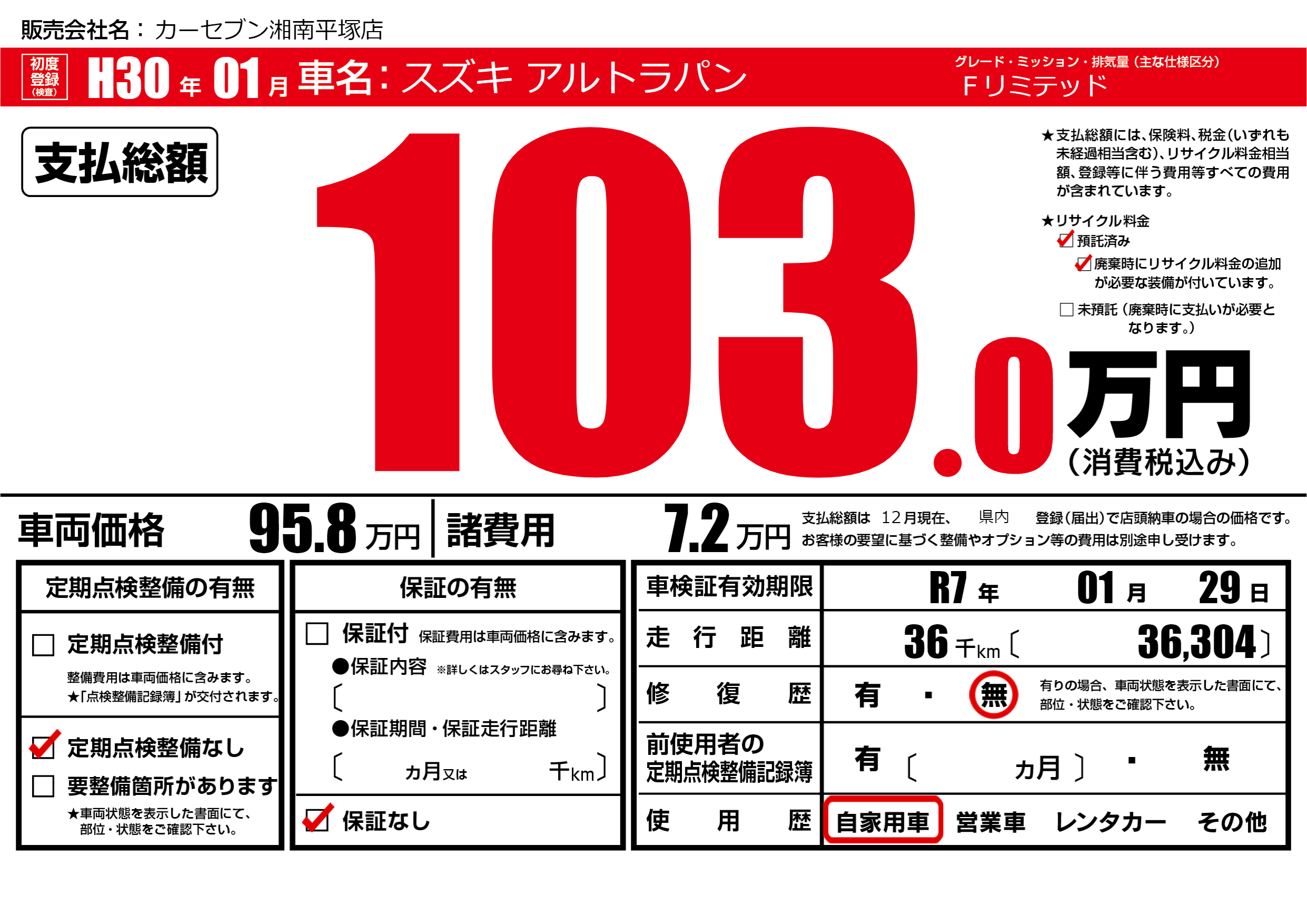 | 車検制限 | R7年 01月 29日 | ||
