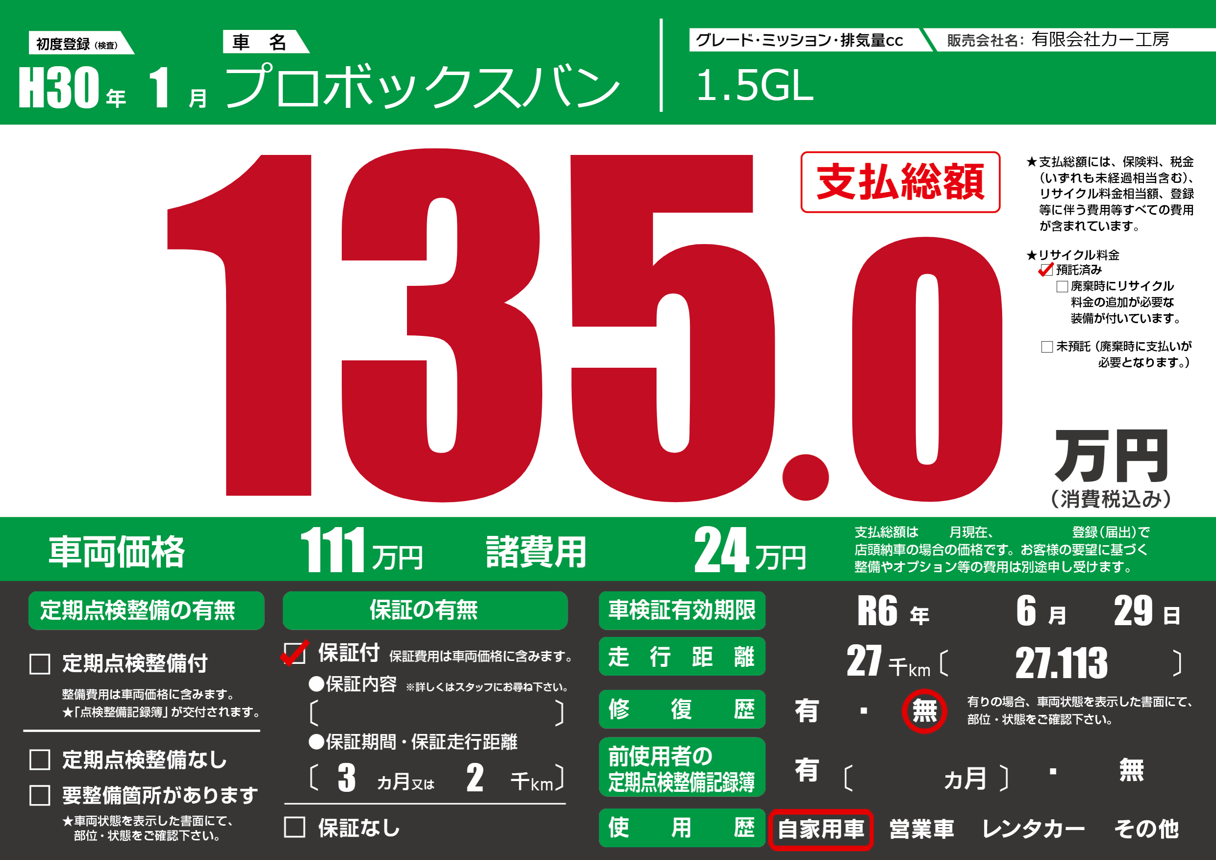 | 車名 | プロボックスバン | グレード ミッション 排気量 |