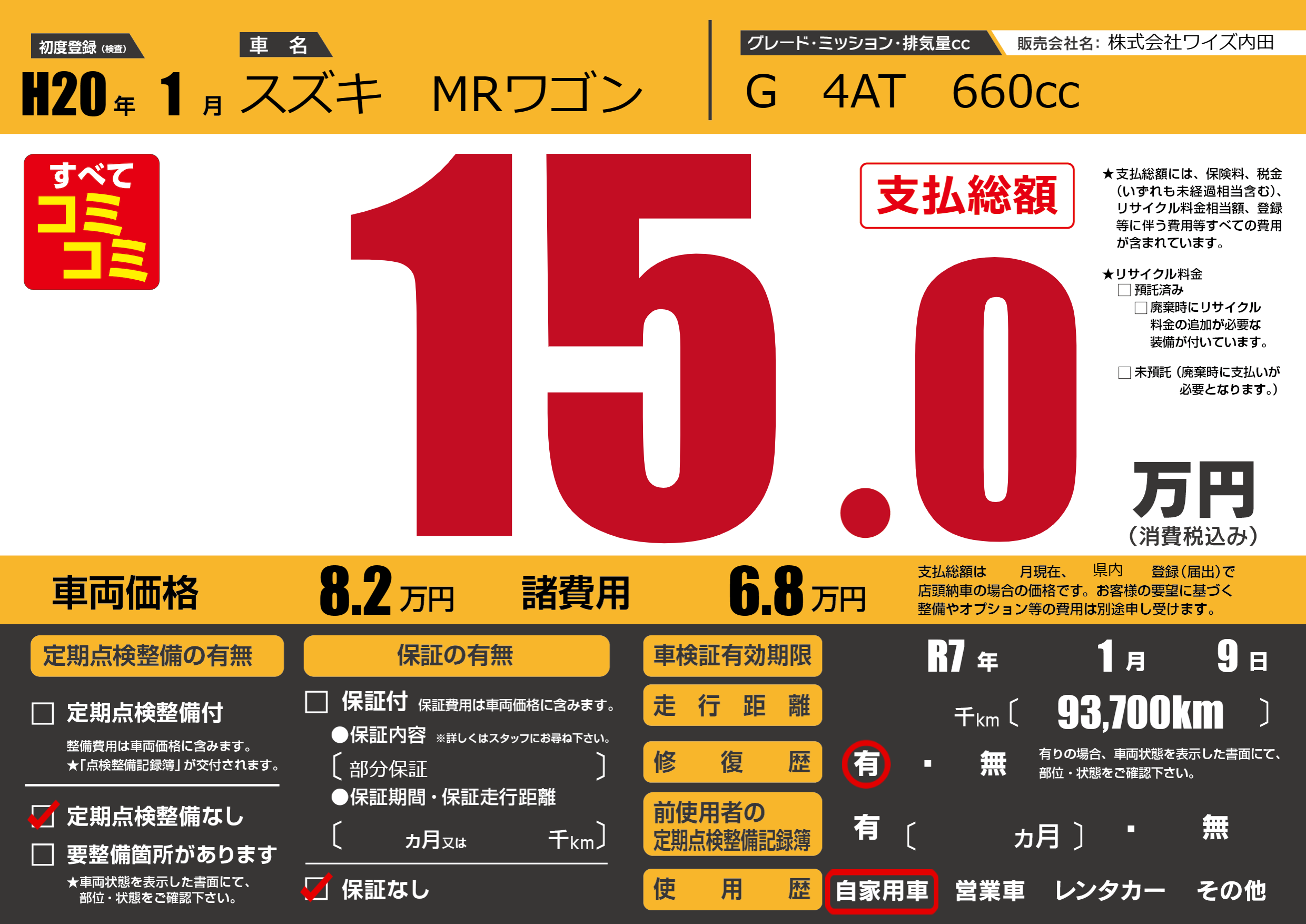 | 車名 | スズキ MRワゴン | グレード ミッション 排気量 |
