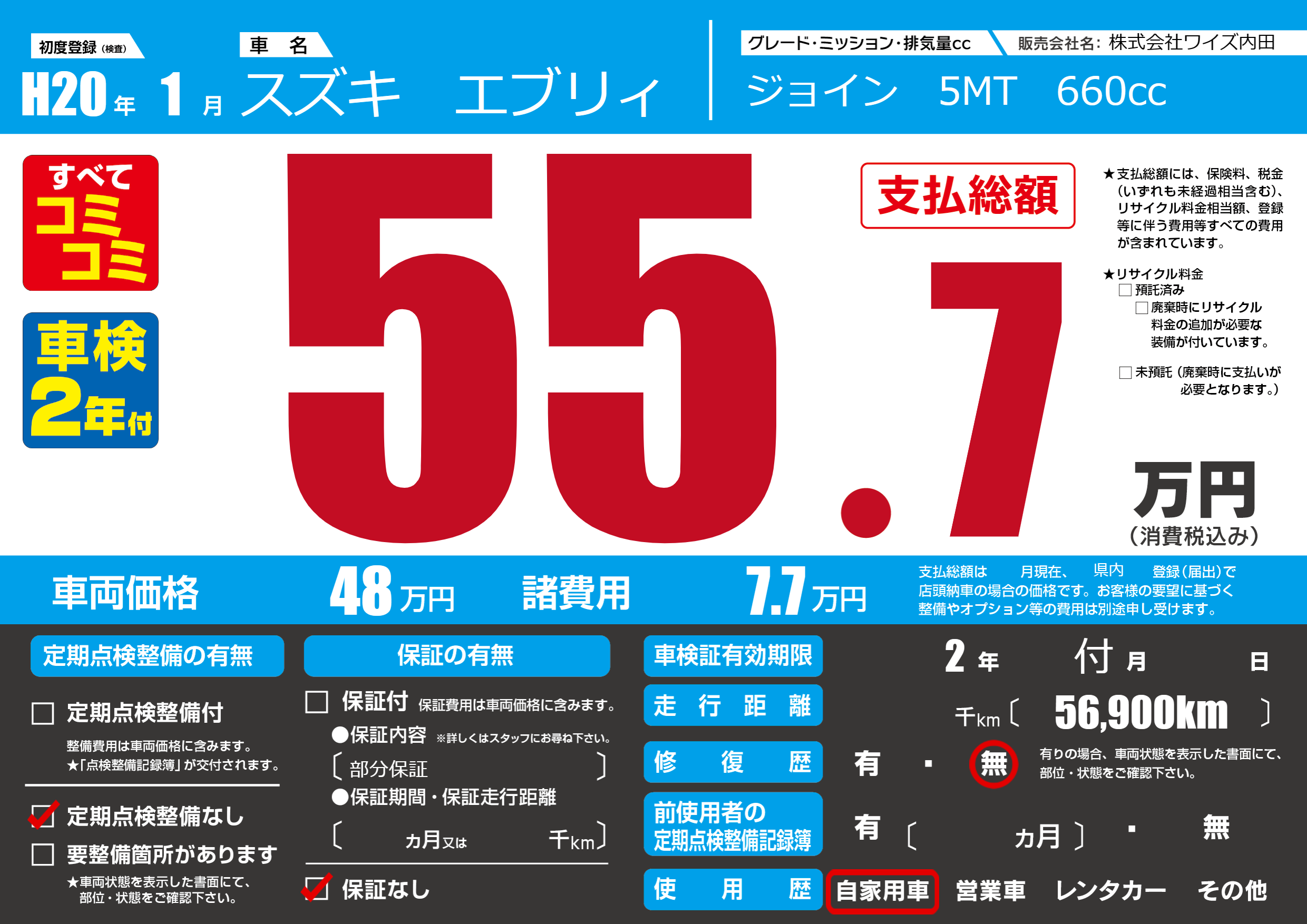 | 車名 | スズキ エブリィ | グレード ミッション 排気量 |