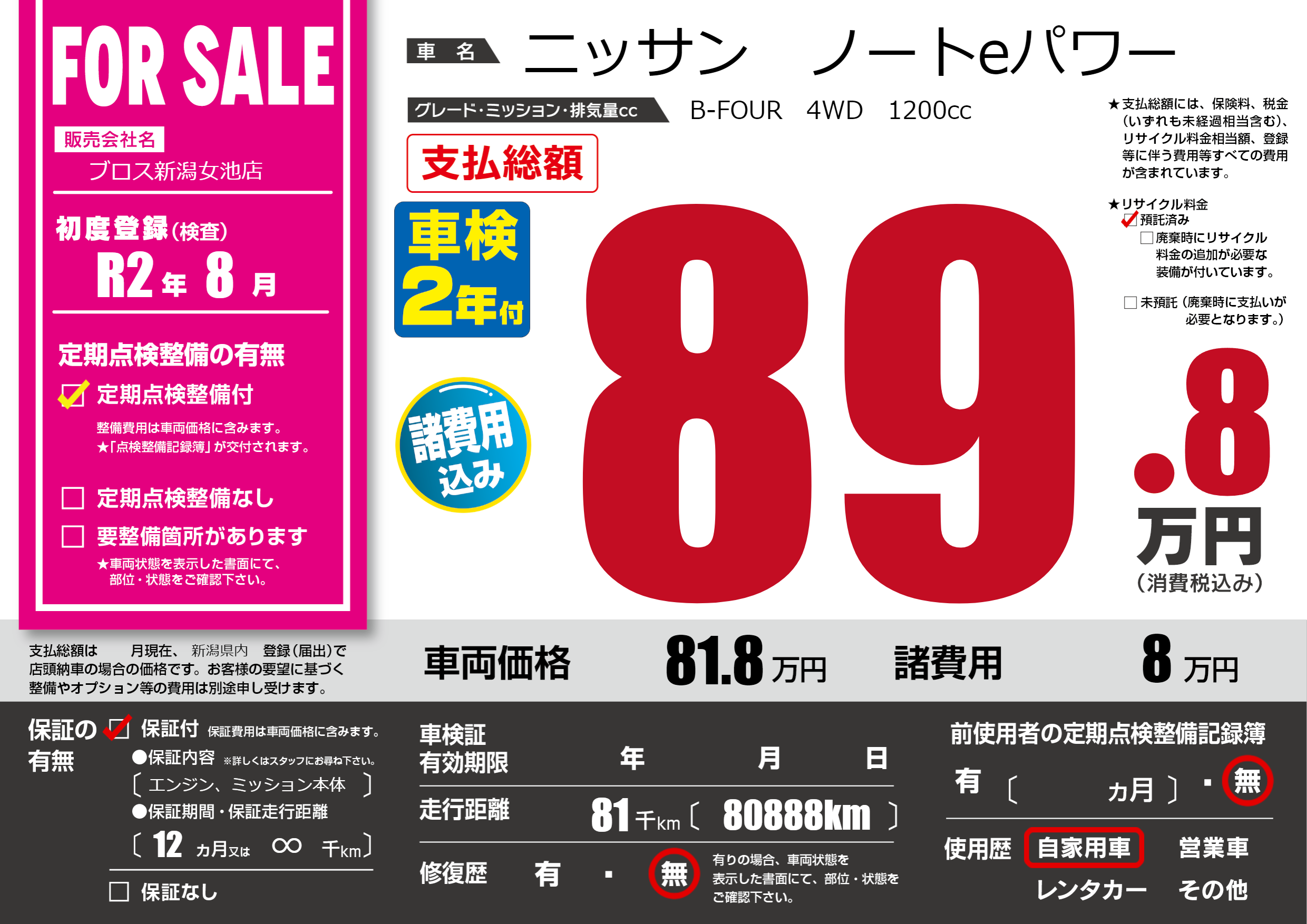 | 車名 | ニッサン ノートeパワー | グレード ミッション 排気量 |