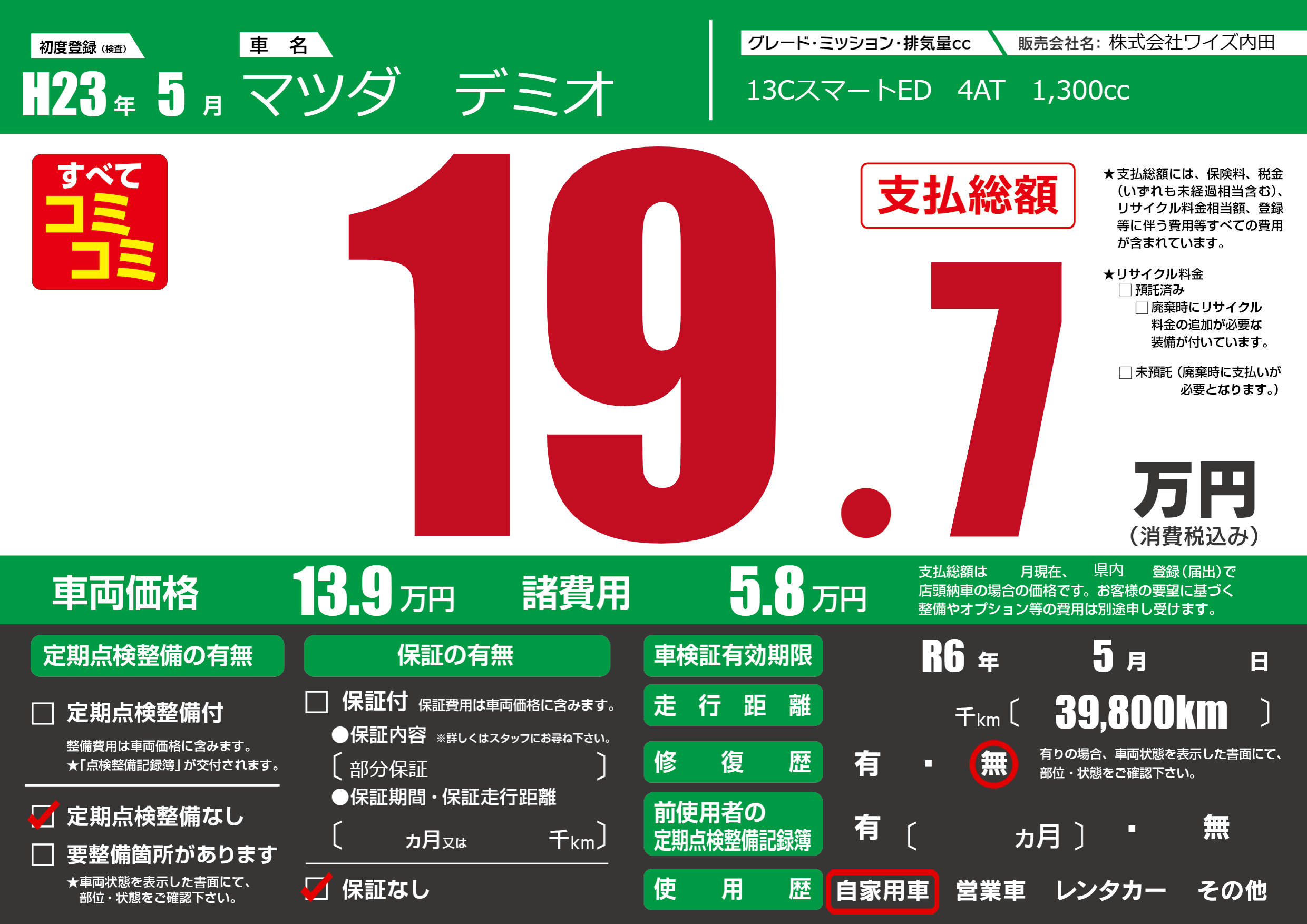 | 車名 | マツダ デミオ | グレード ミッション 排気量 |