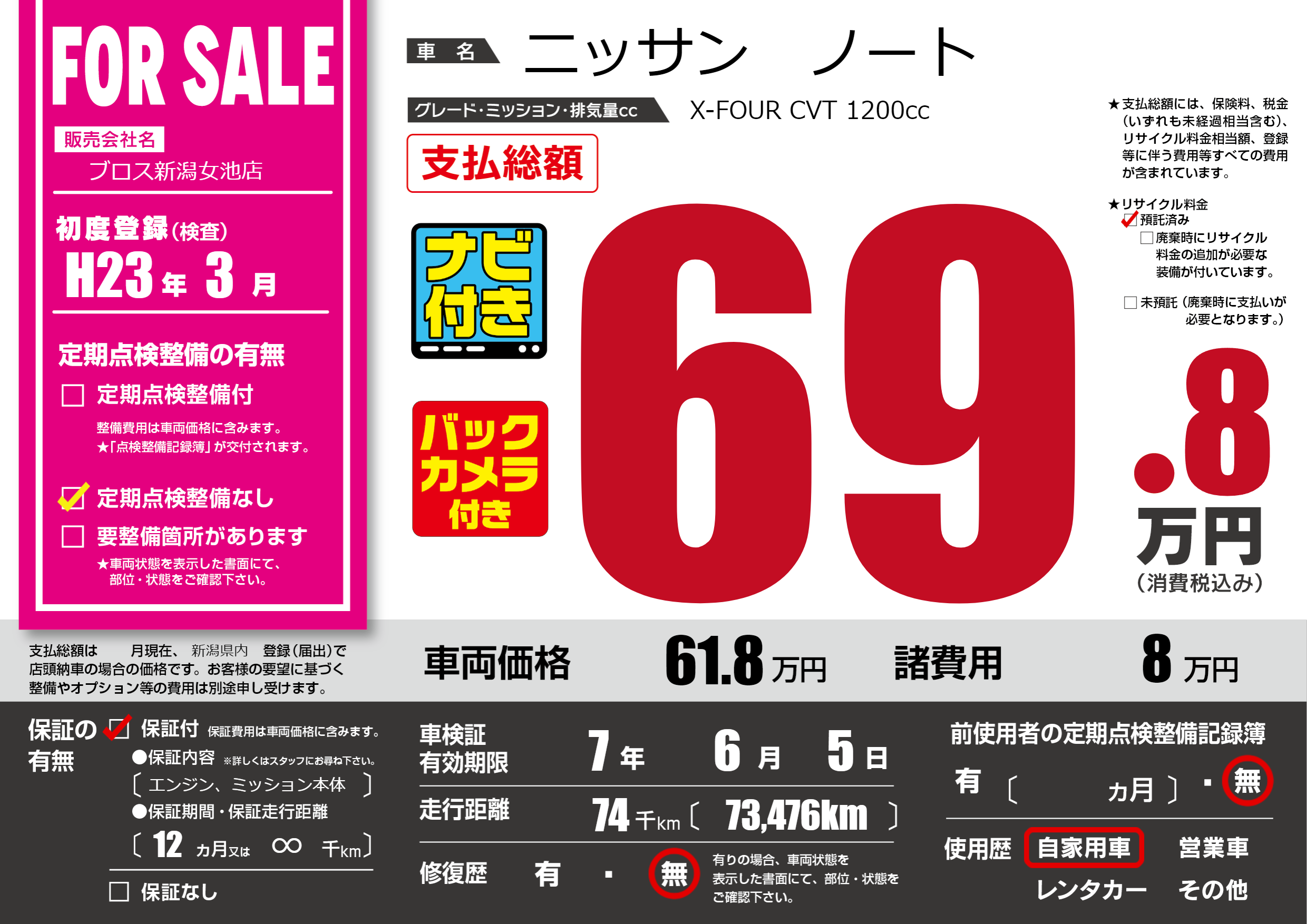 | 車名 | ニッサン ノート | グレード ミッション 排気量 |