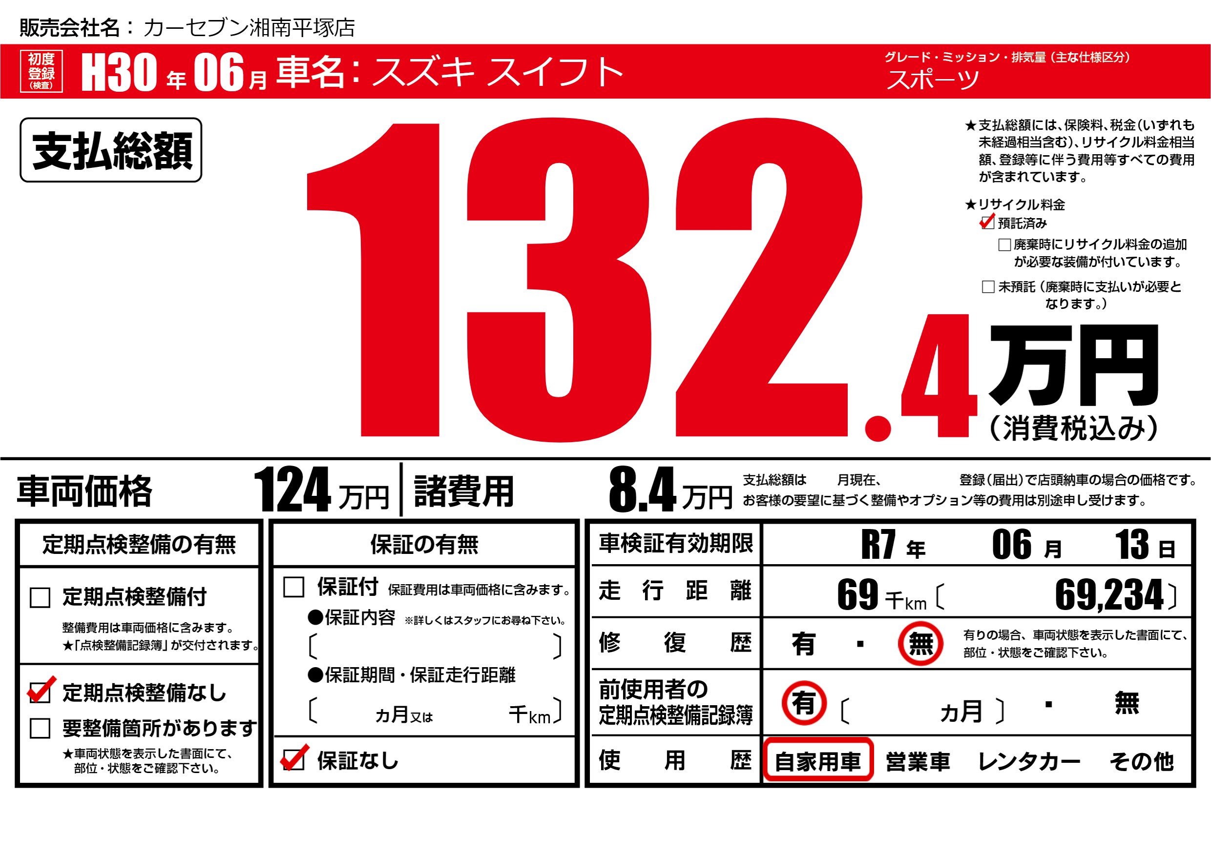 | 車名 | スズキ スイフト | グレード ミッション 排気量 |