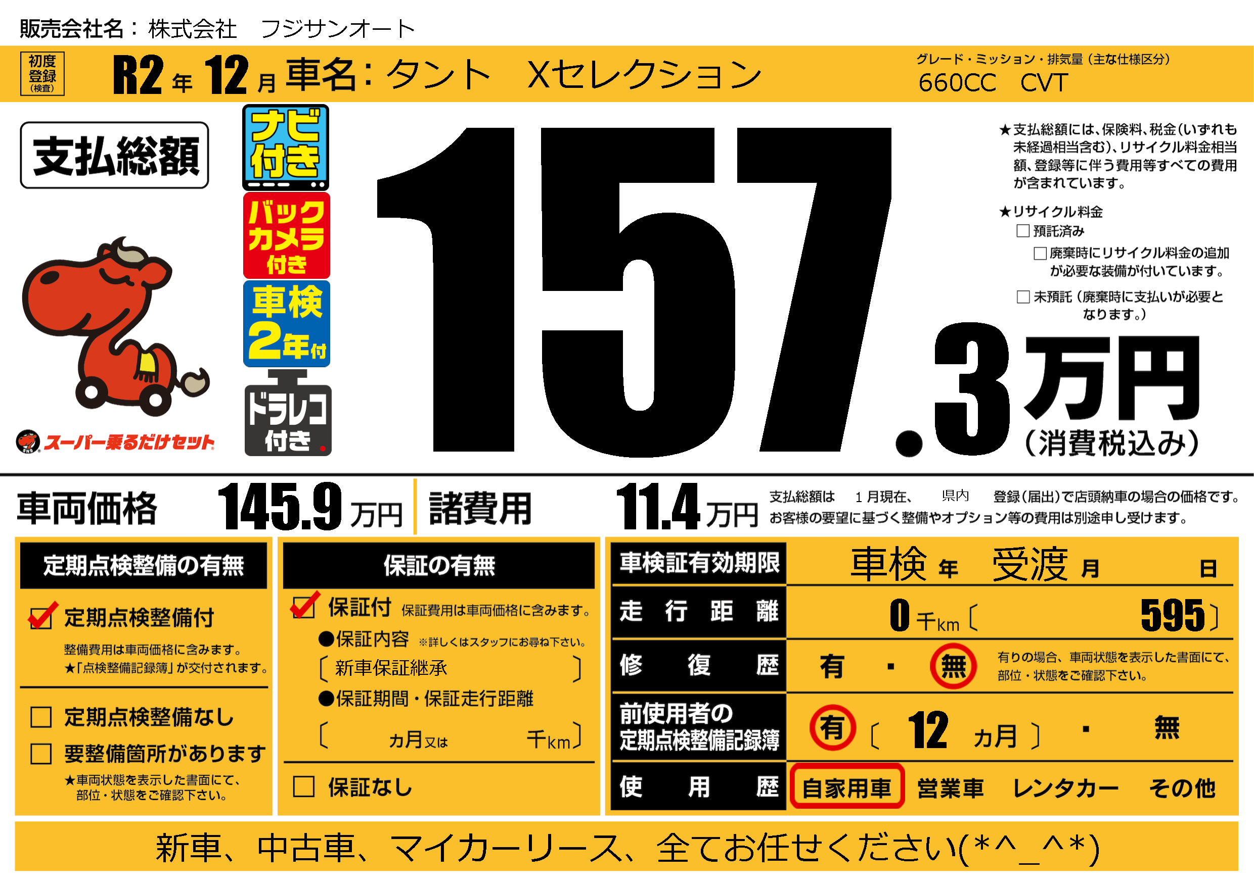 | 走行キロ | - | 初年度登録 | R2年12月 |