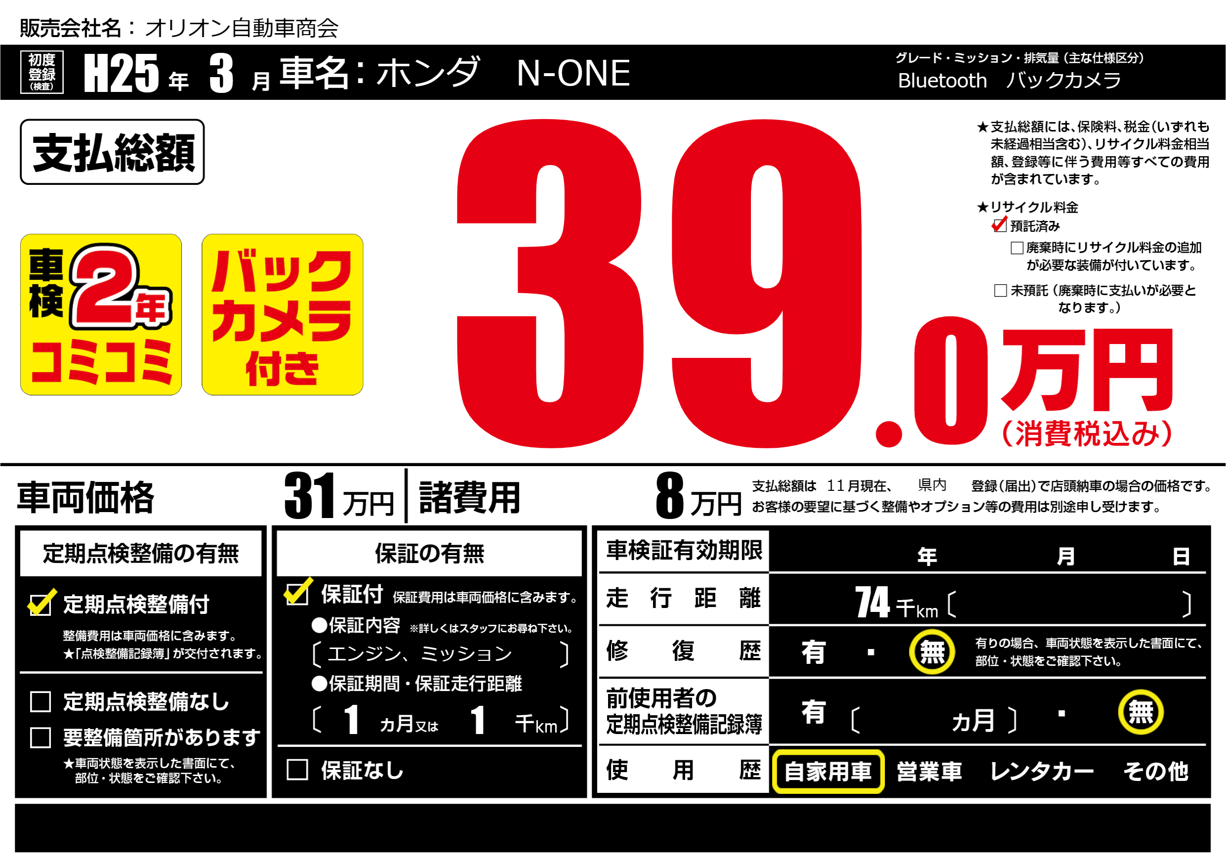 | 車名 | ホンダ N-ONE | グレード ミッション 排気量 |