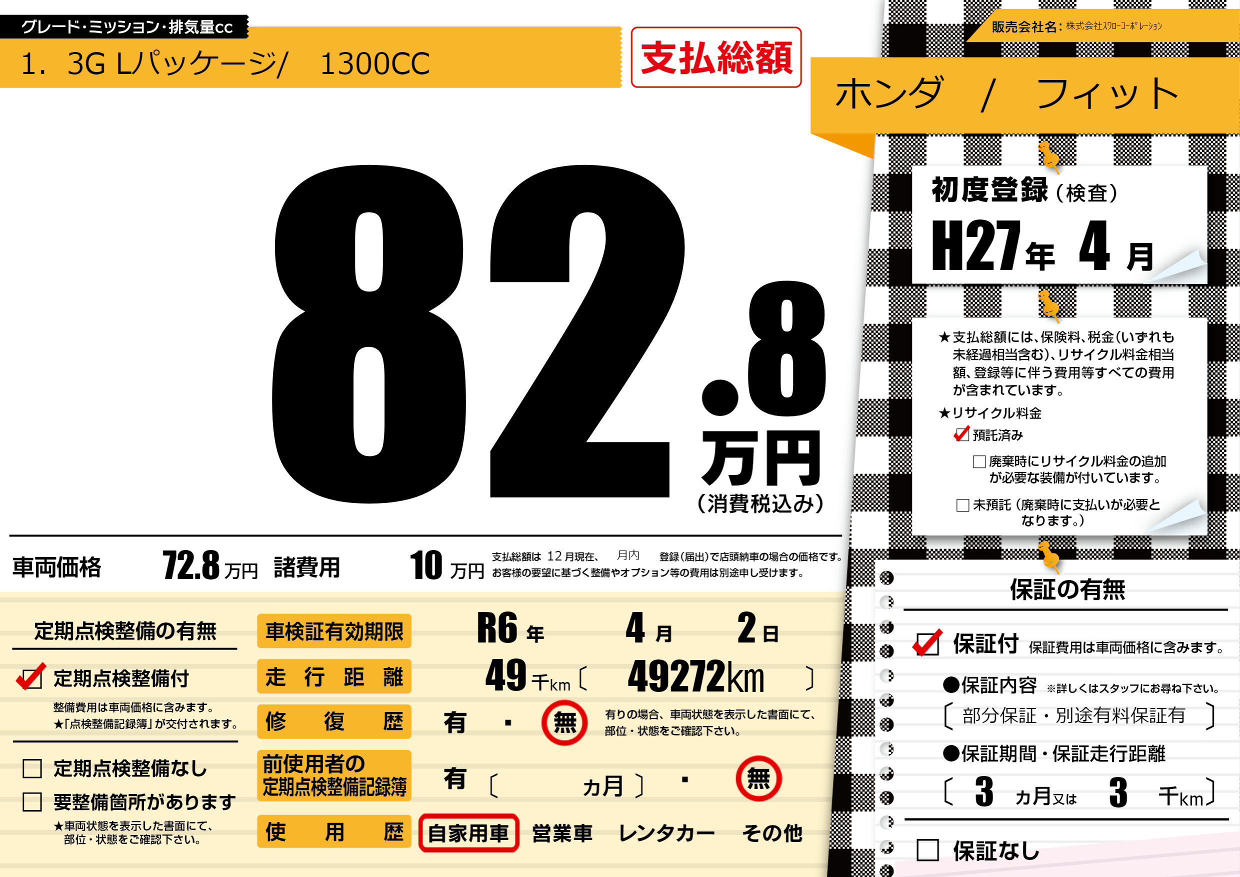 | 走行キロ | 4.9万km | 初年度登録 | H27年4月 |