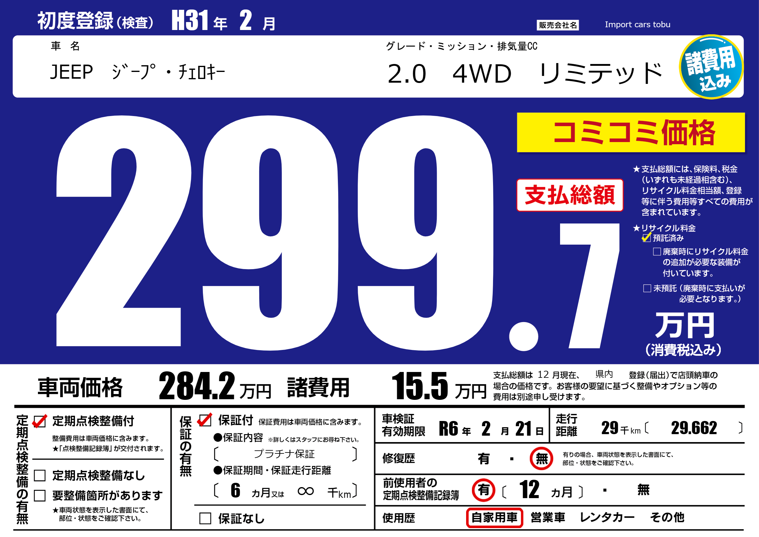 | 車名 | JEEP ジープ・チェロキー | グレード ミッション 排気量 |