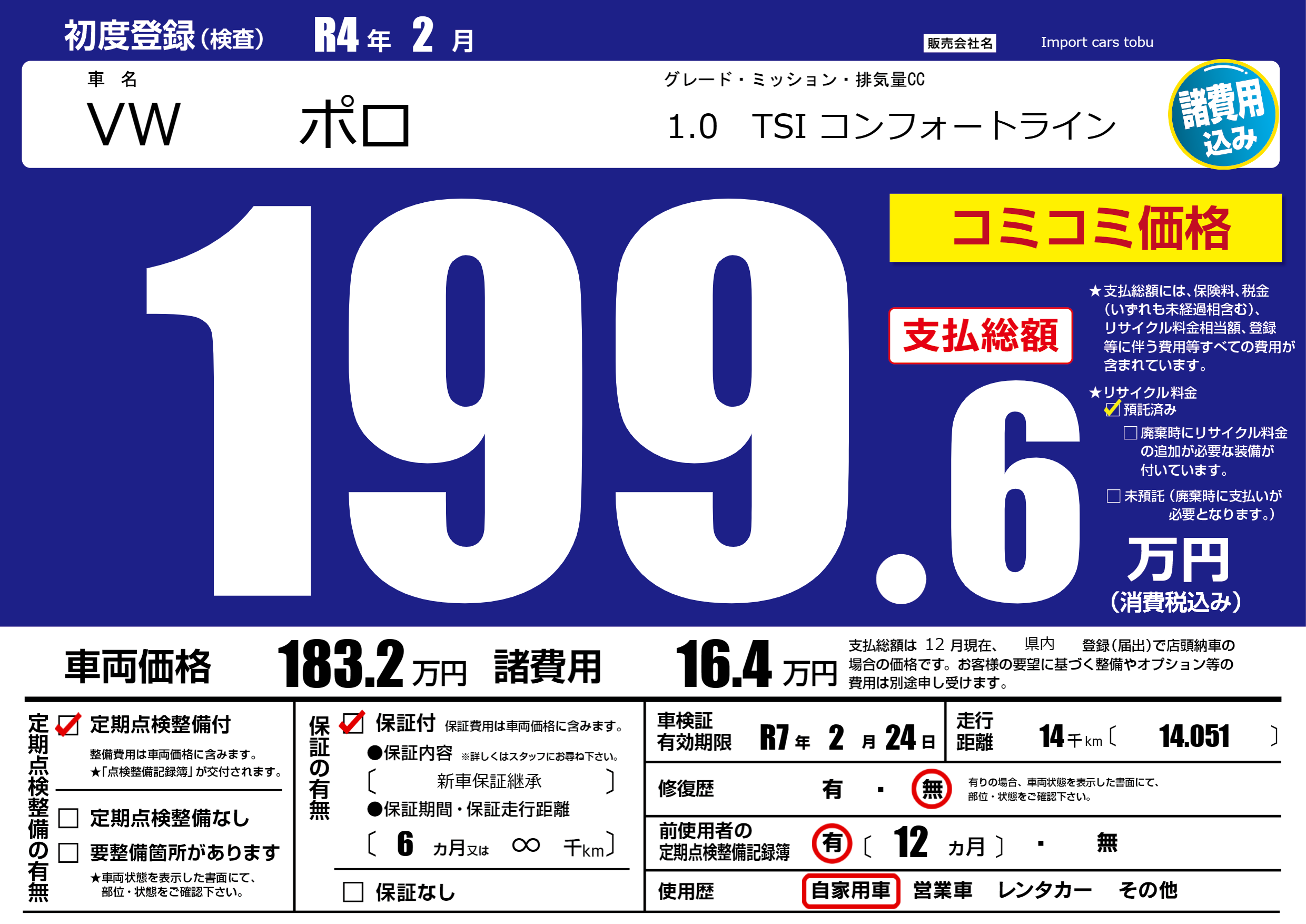 | 車名 | VW ポロ | グレード ミッション 排気量 |