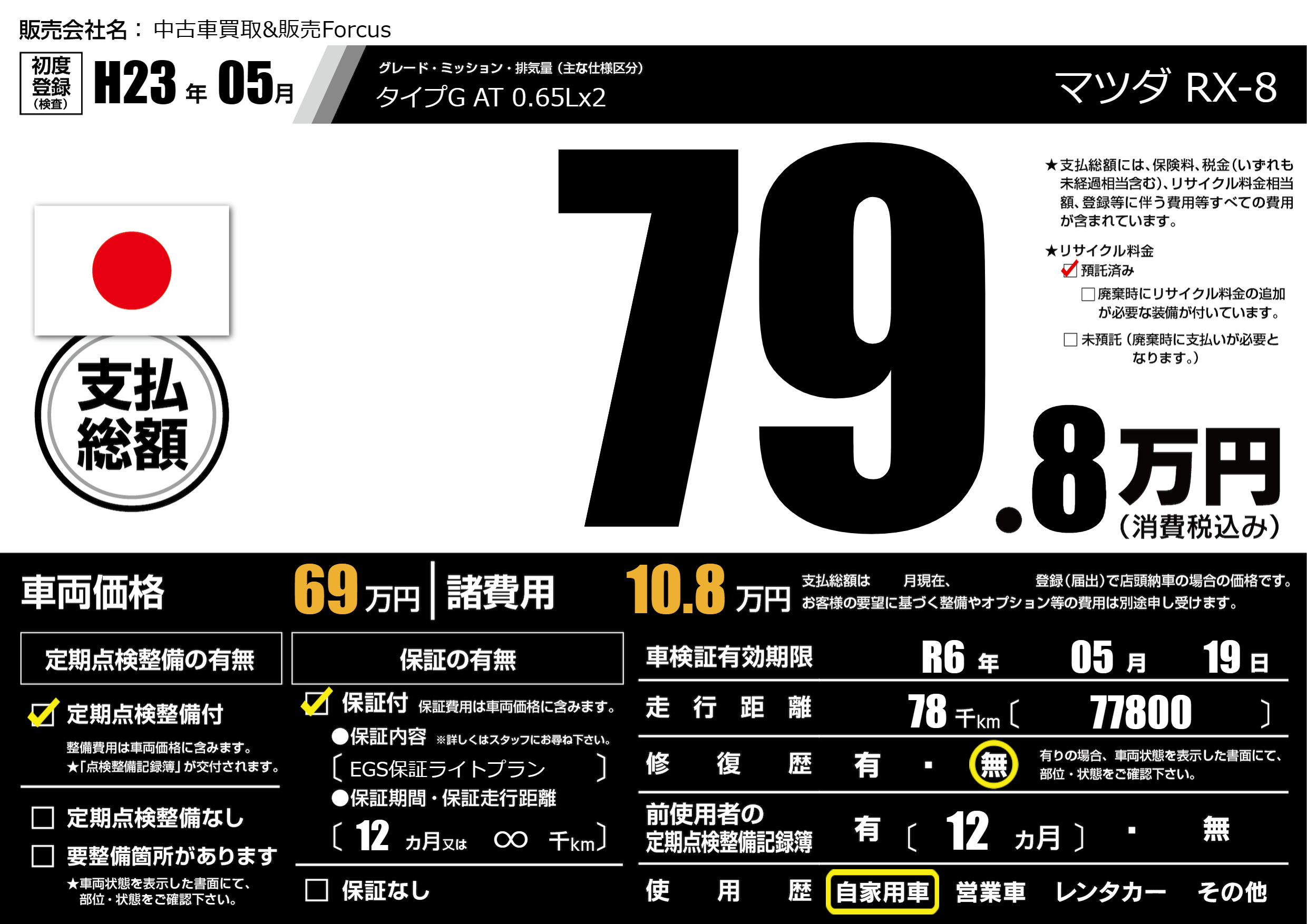 | 走行キロ | 7.8万km | 初年度登録 | H23年05月 |