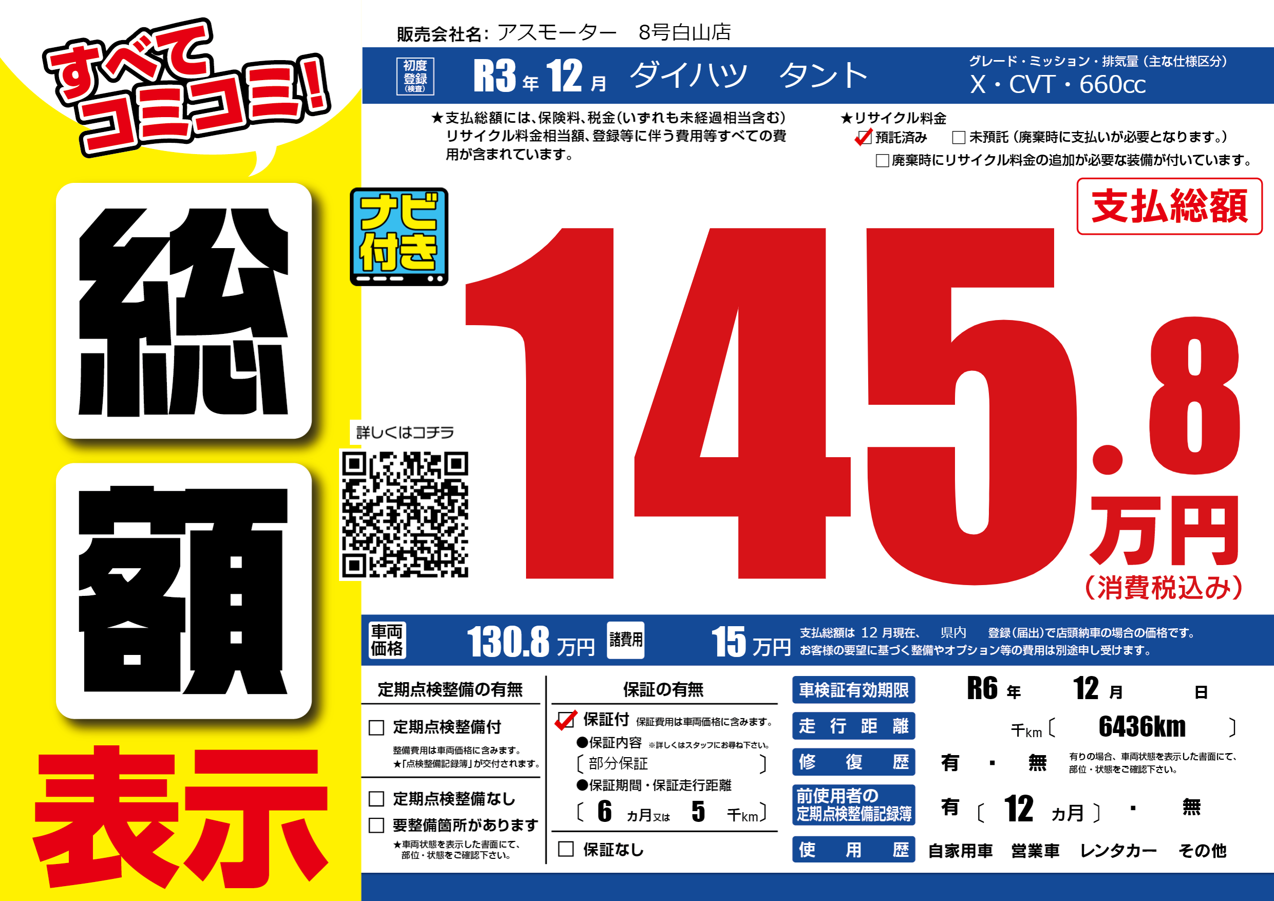 | 走行キロ | - | 初年度登録 | R3年12月 |