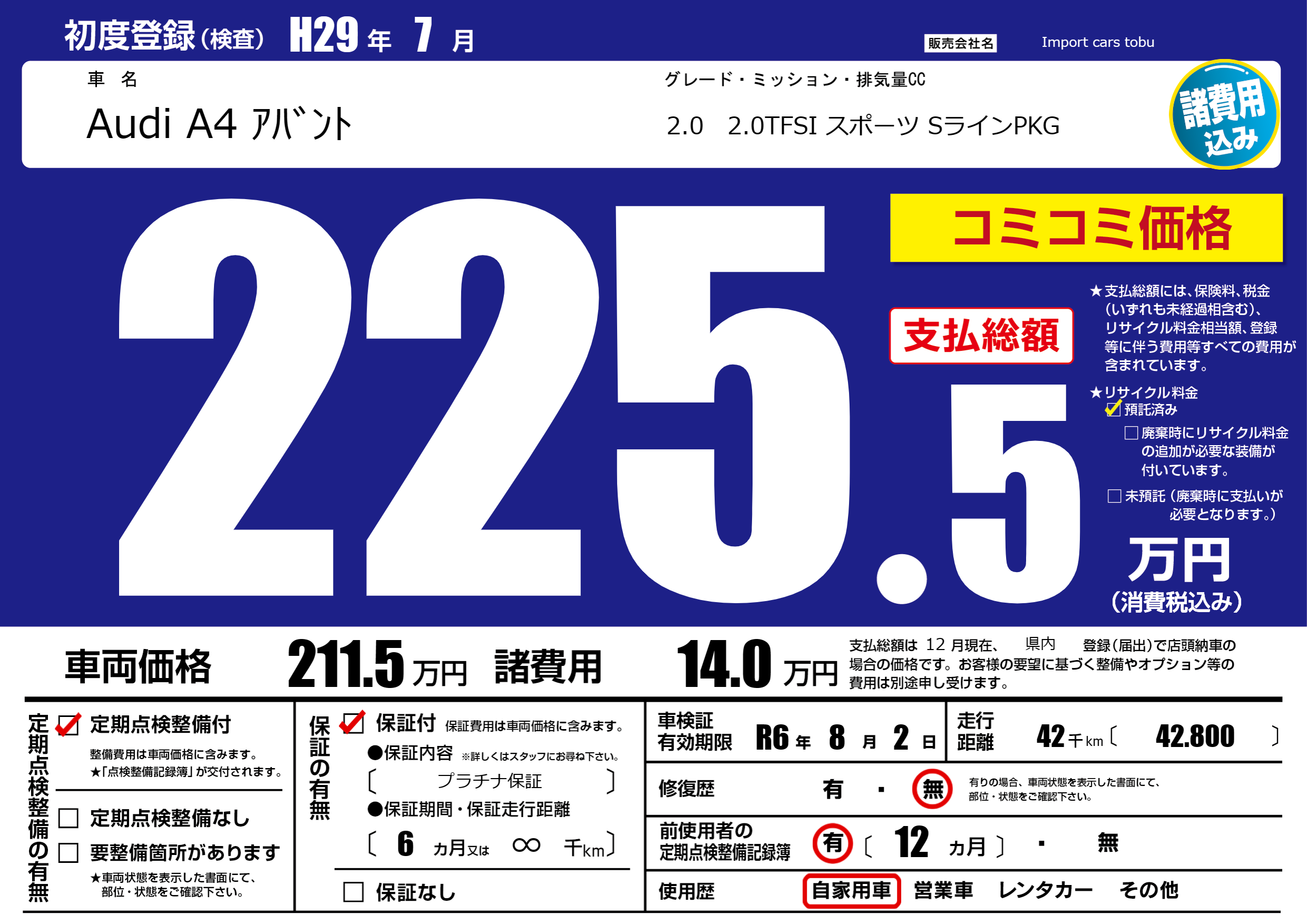 | 車名 | Audi A4 アバント | グレード ミッション 排気量 |