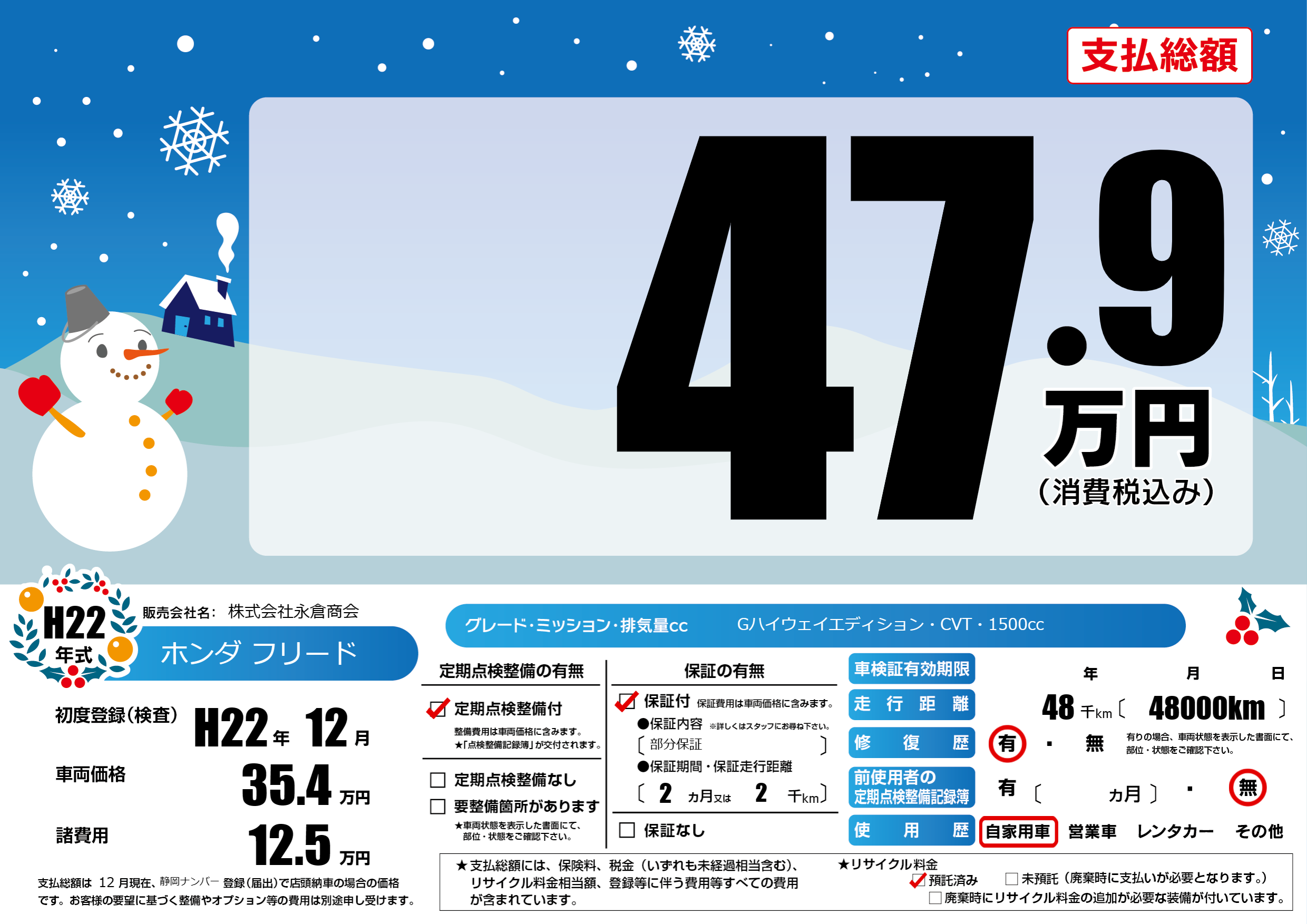 | 走行キロ | 4.8万km | 初年度登録 | H22年12月 |