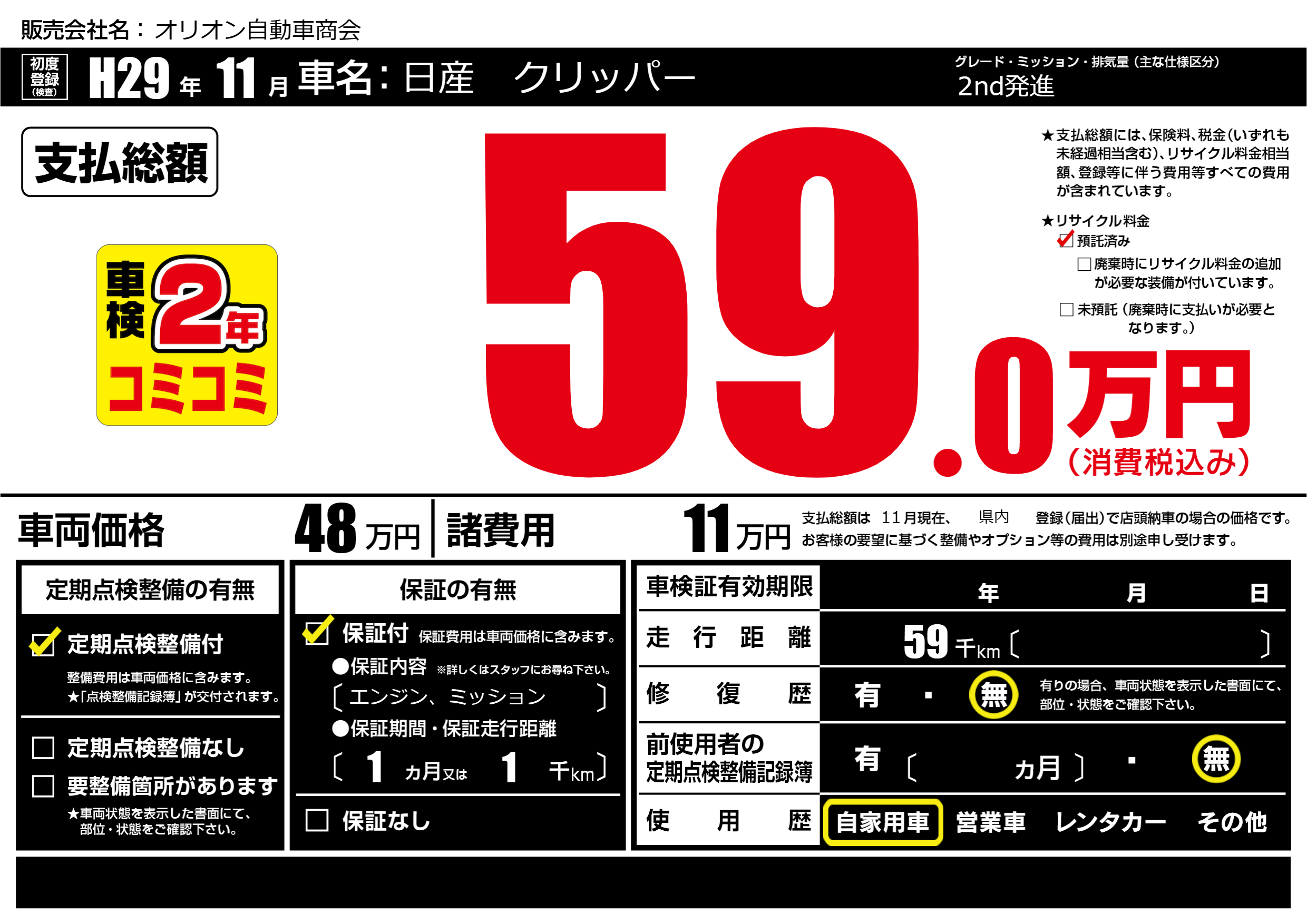 | 車名 | 日産 クリッパー | グレード ミッション 排気量 |