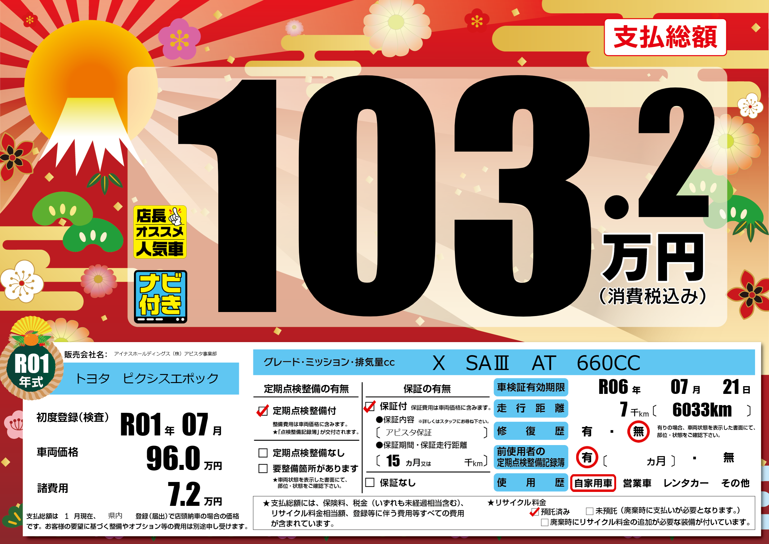 | 車名 | トヨタ ピクシスエポック | グレード ミッション 排気量 |