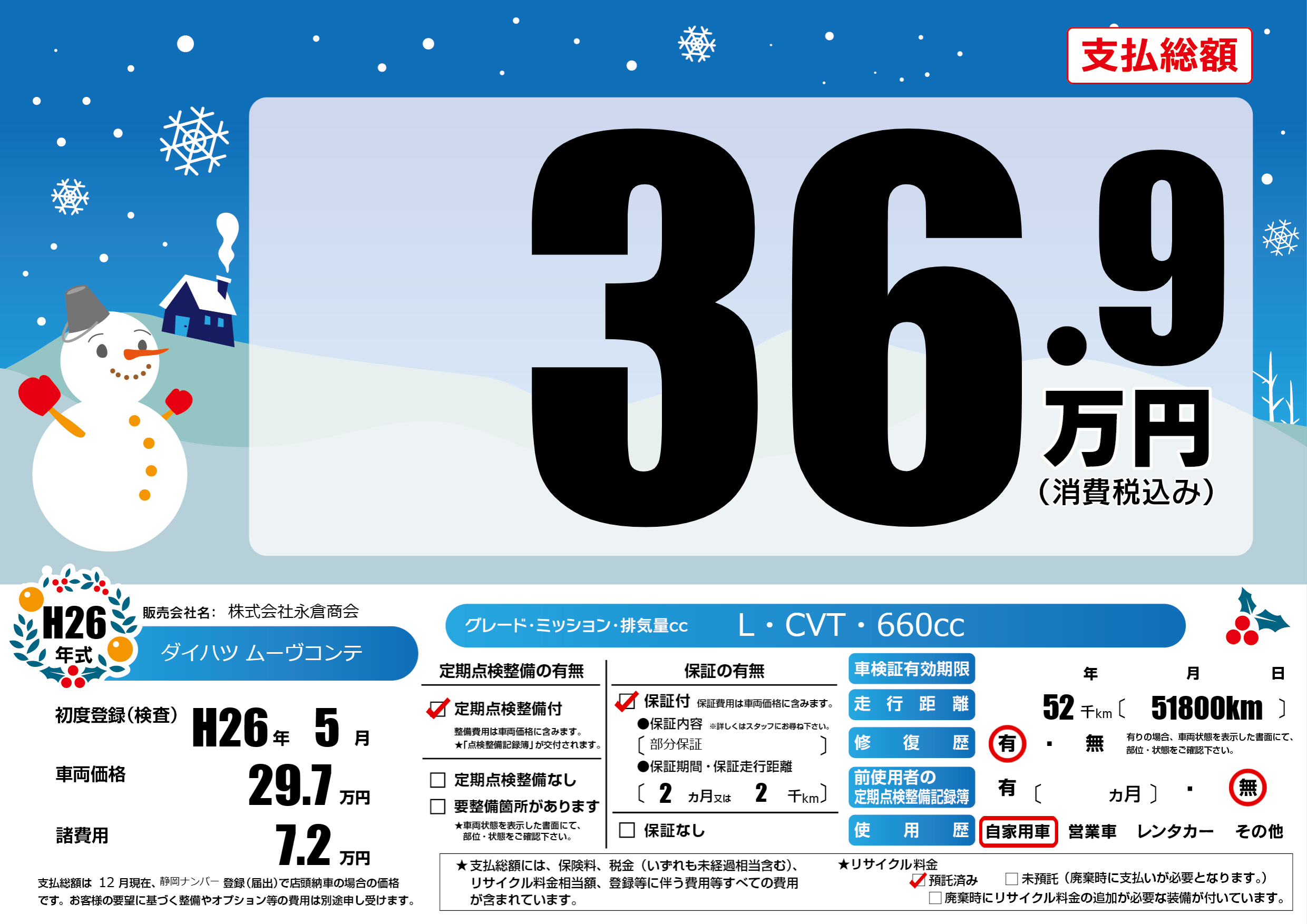 | 車名 | ダイハツ ムーヴコンテ | グレード ミッション 排気量 |