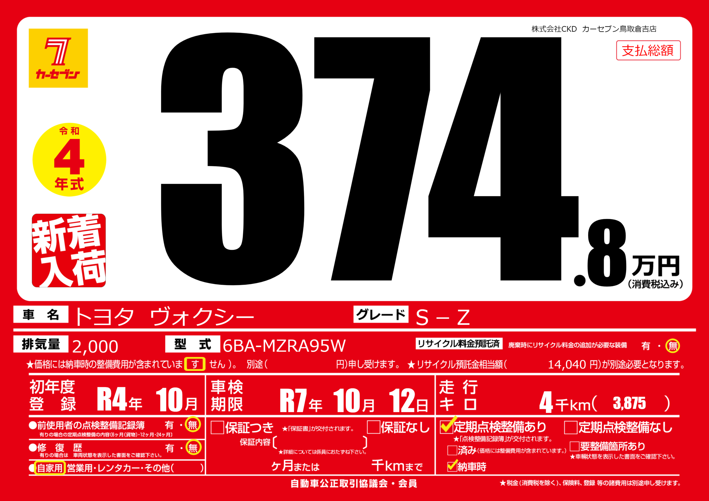 | 走行キロ | 0.4万km | 初年度登録 | R4年10月 |
