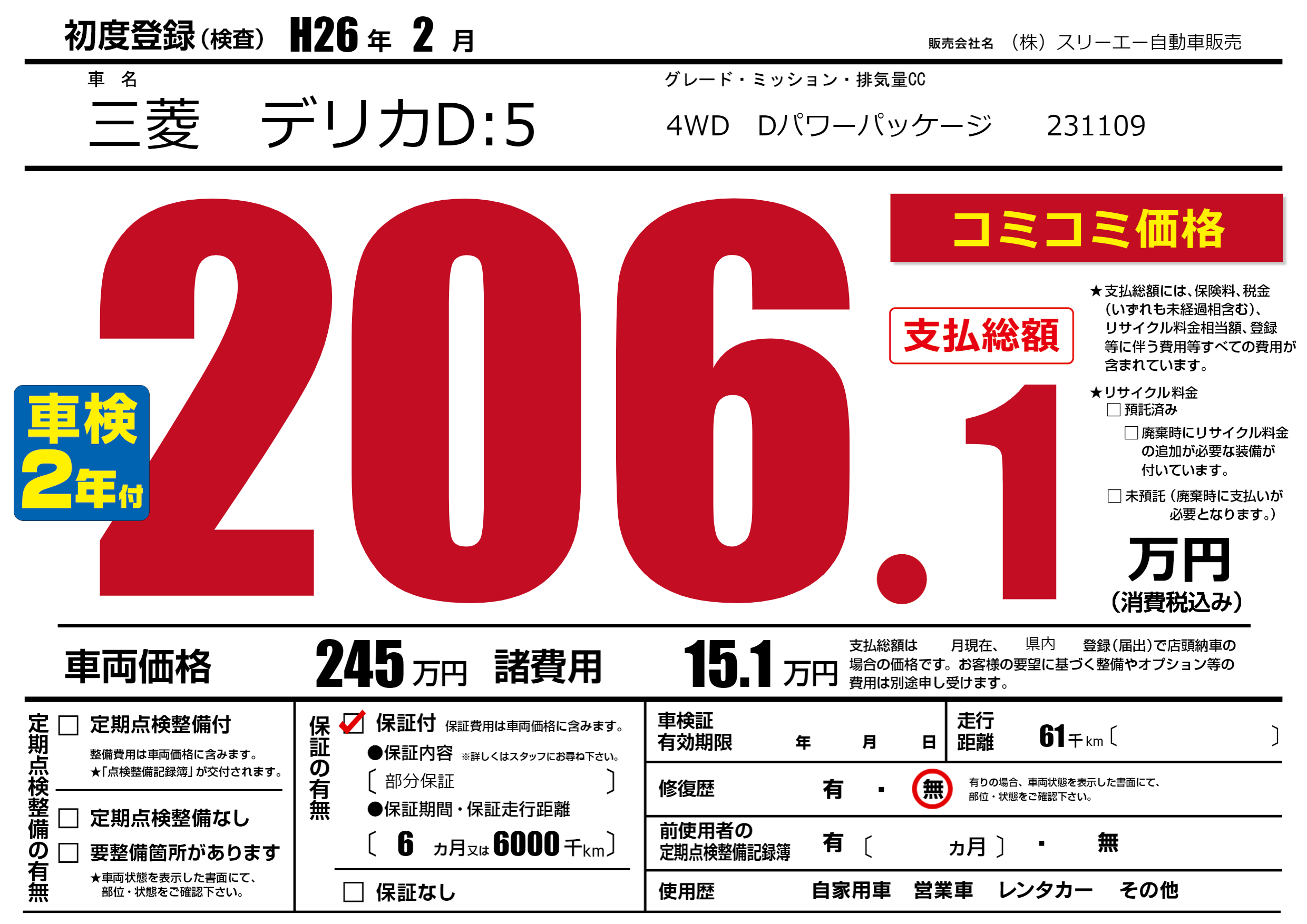 保証付き 保証内容(部分保証) 6ヶ月または(6000)千kmまで |