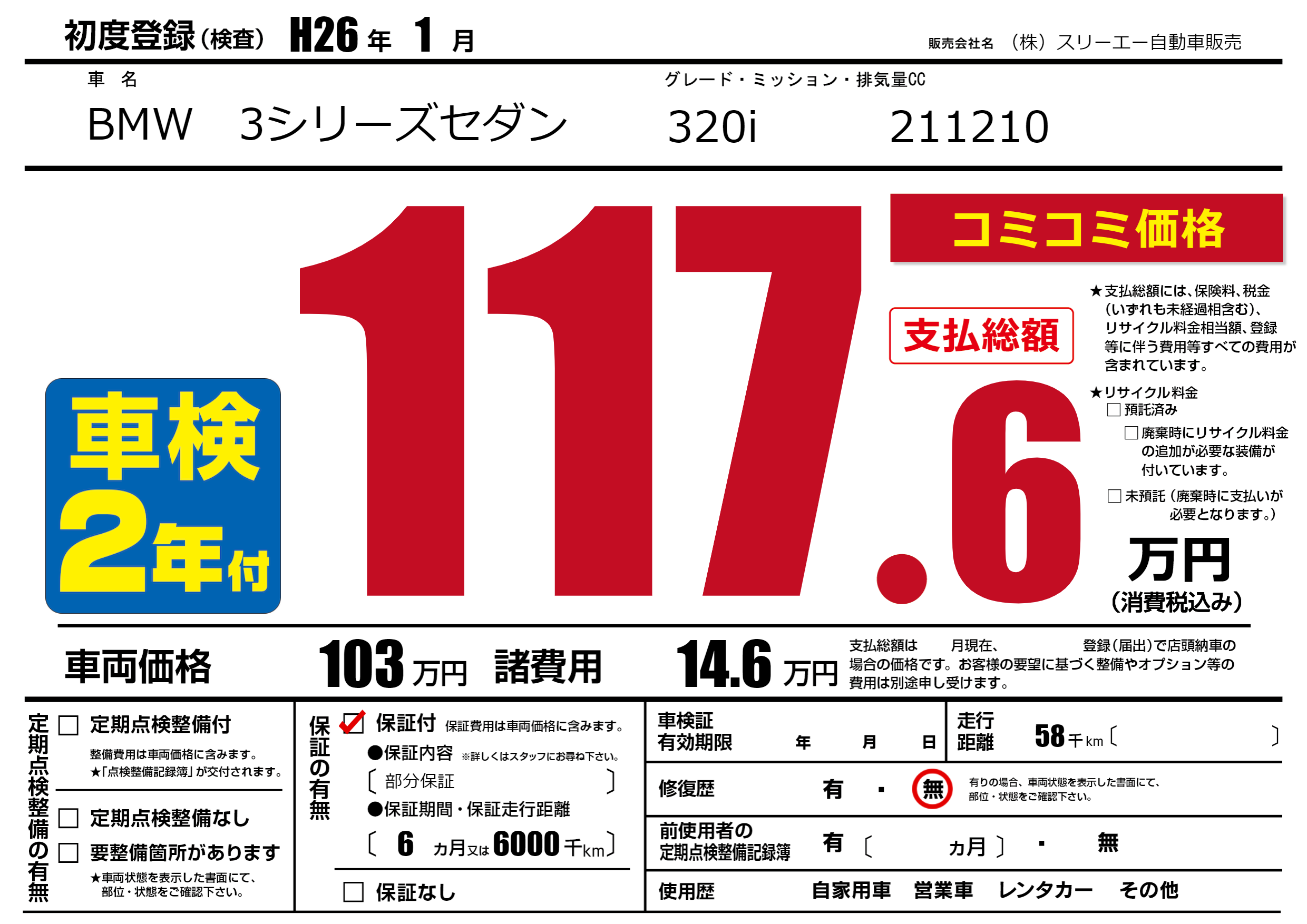 | 車名 | BMW 3シリーズセダン | グレード ミッション 排気量 |