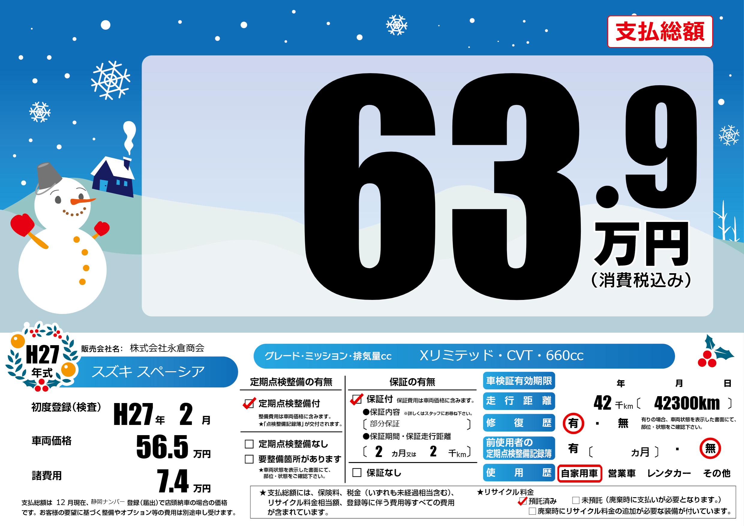 | 走行キロ | 4.2万km | 初年度登録 | H27年2月 |