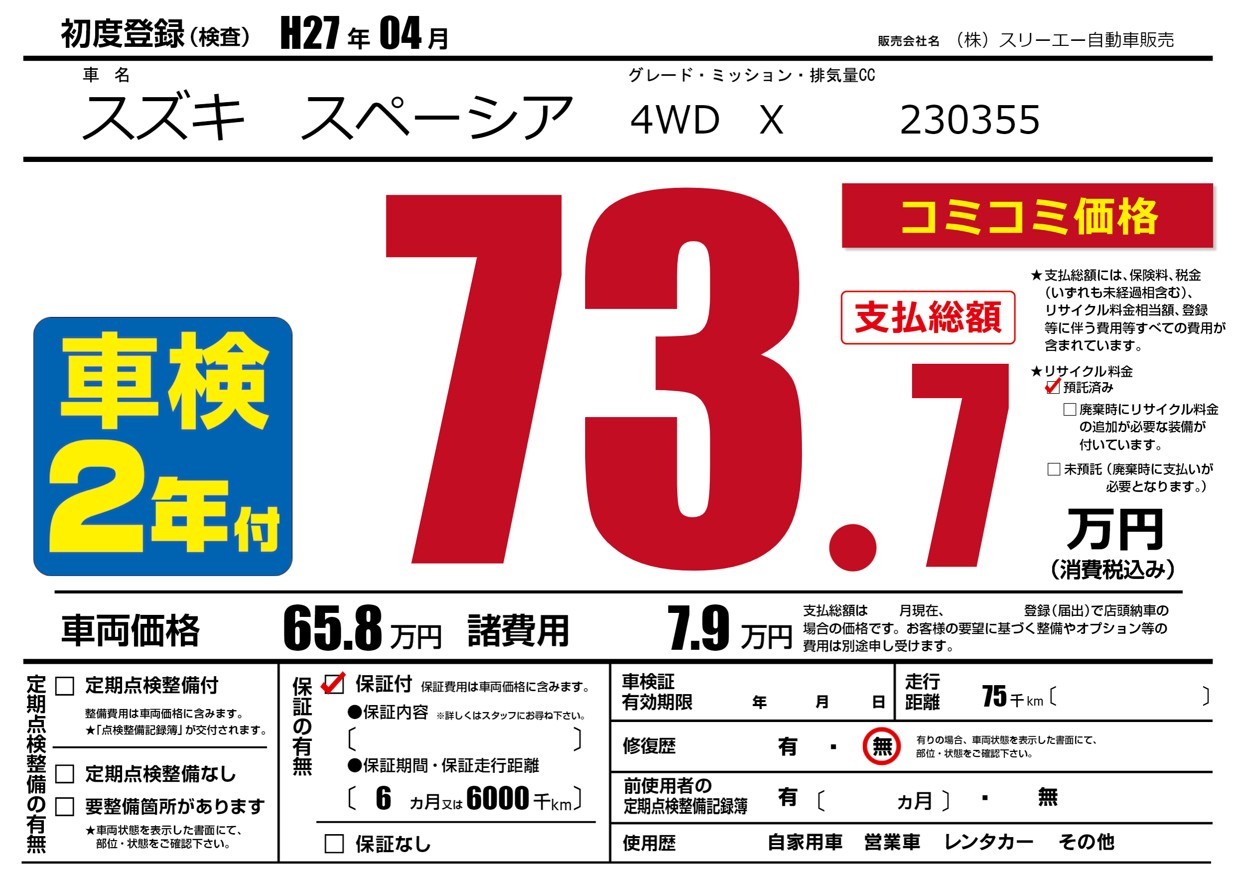 保証付き 保証内容(---) 6ヶ月または(6000)千kmまで |
