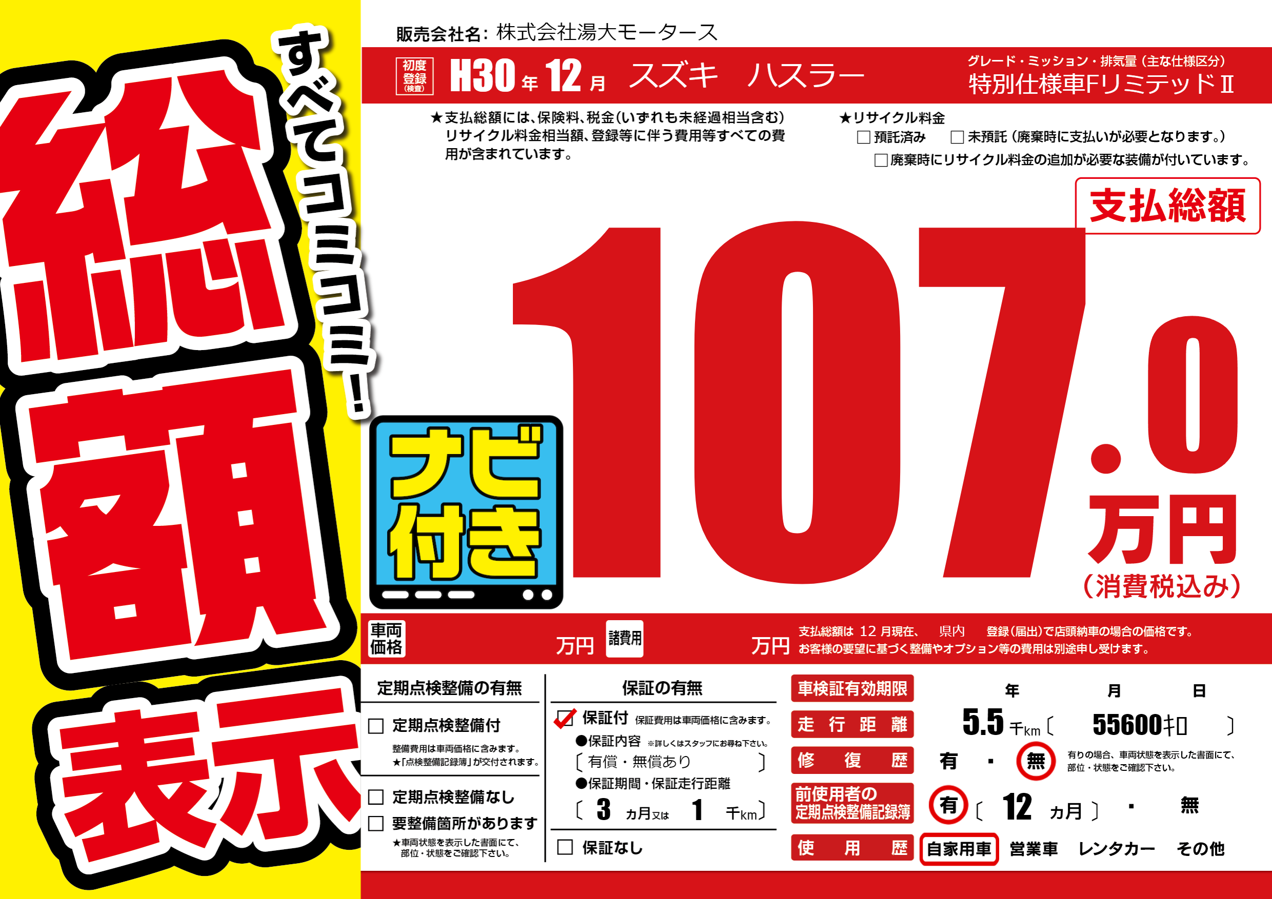 | 車名 | スズキ ハスラー | グレード ミッション 排気量 |