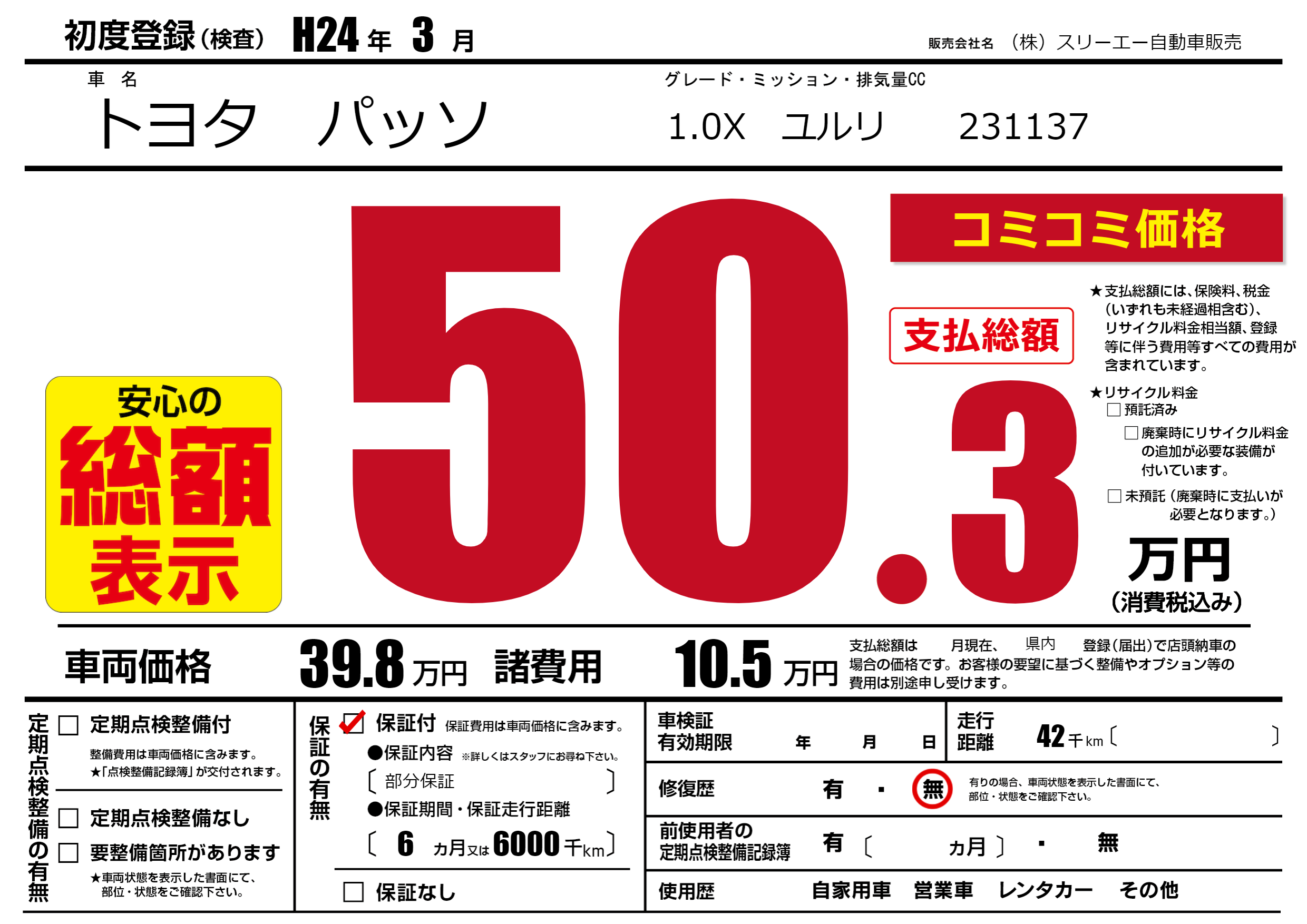 | 車名 | トヨタ パッソ | グレード ミッション 排気量 |