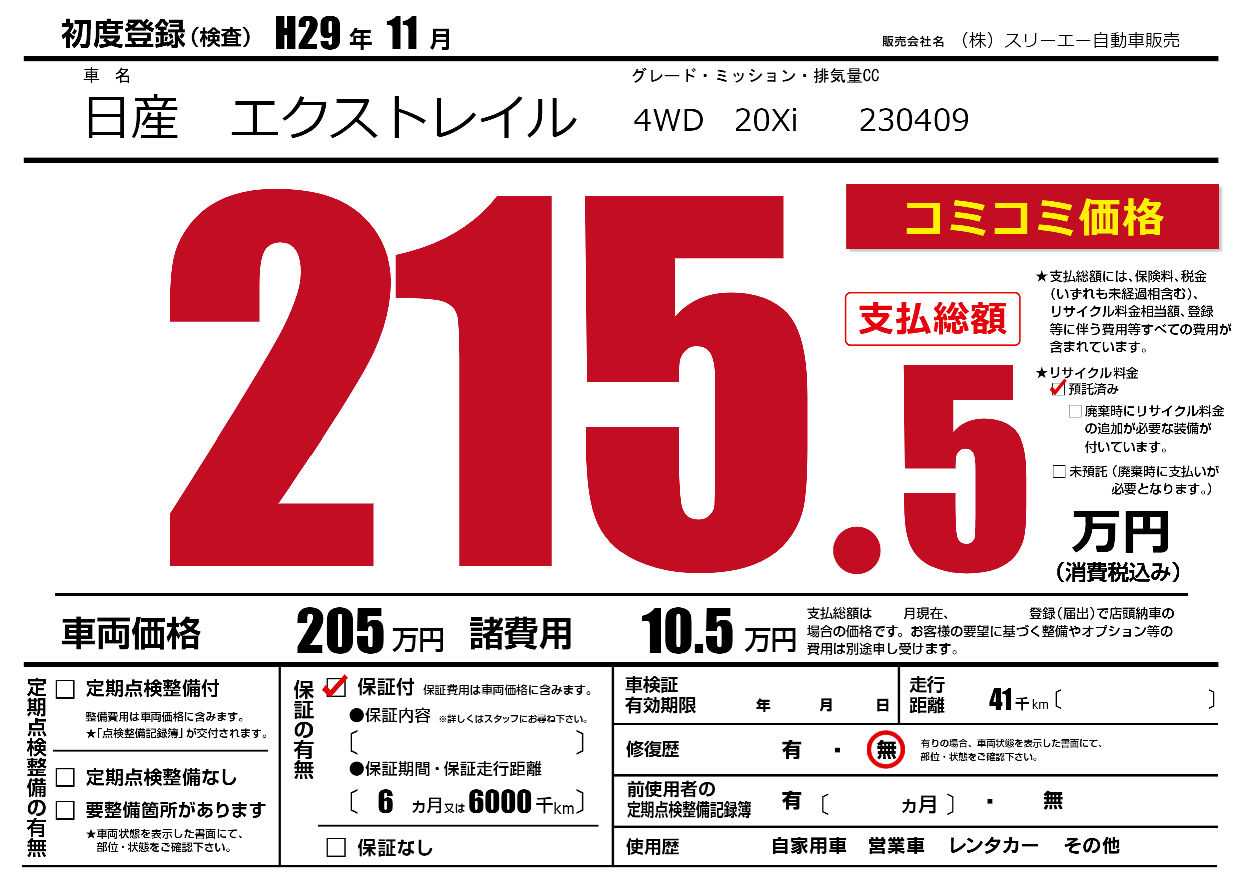 | 走行キロ | 4.1万km | 初年度登録 | H29年11月 |