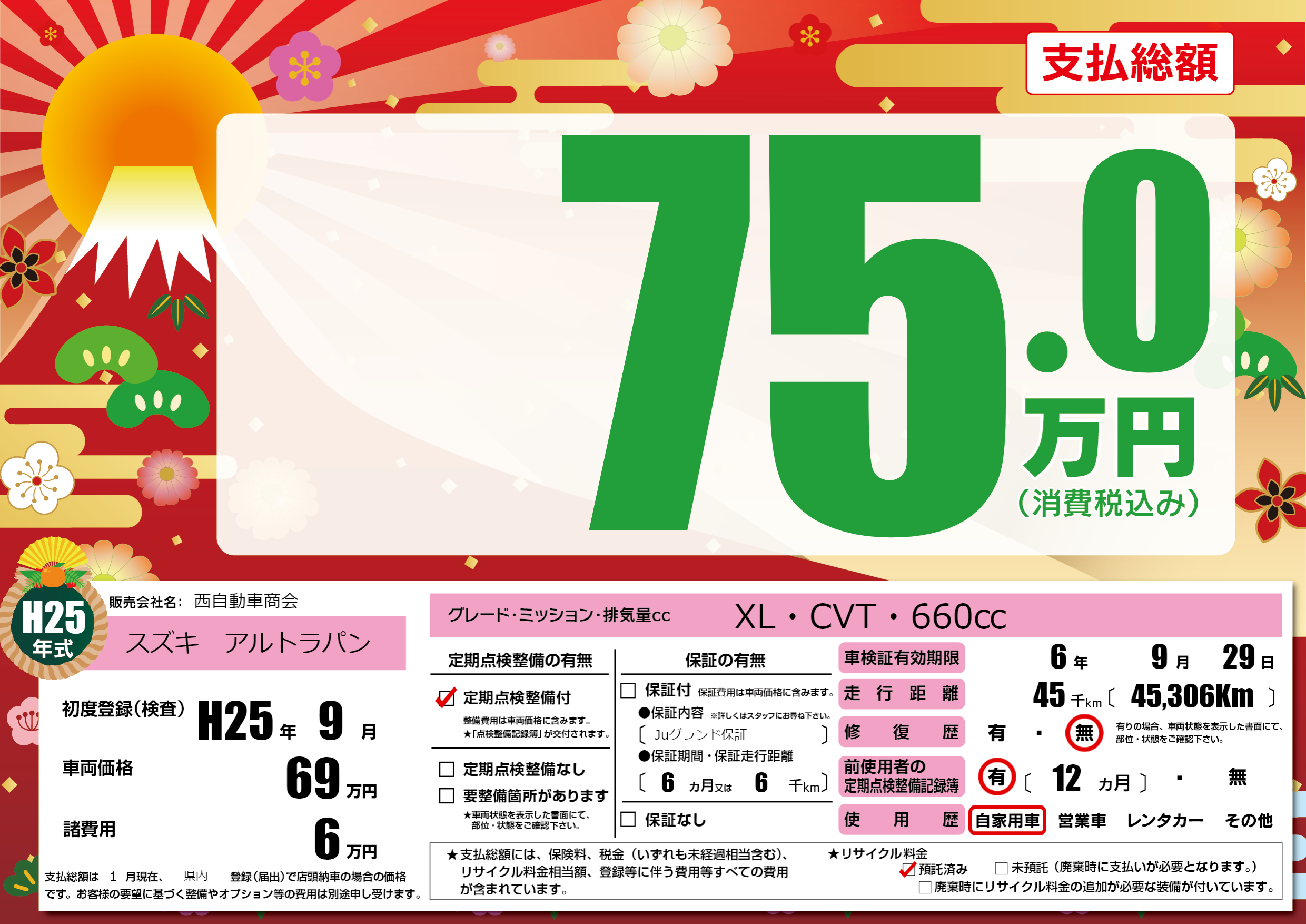 | 走行キロ | 4.5万km | 初年度登録 | H25年9月 |